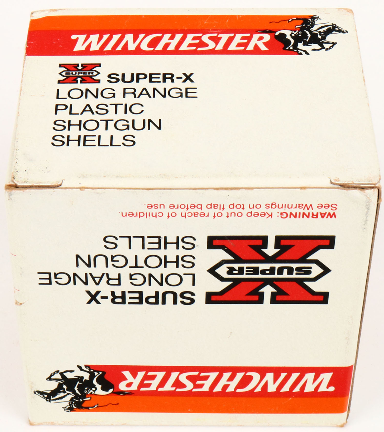 Winchester, Super-X, 28ga., 1pc., Full., 2 3/4'', shot size 7 1/2, multi colored box with tear on top, box has very nice colors, shells are very good. Grade: Excellent - Value: 10 to 30