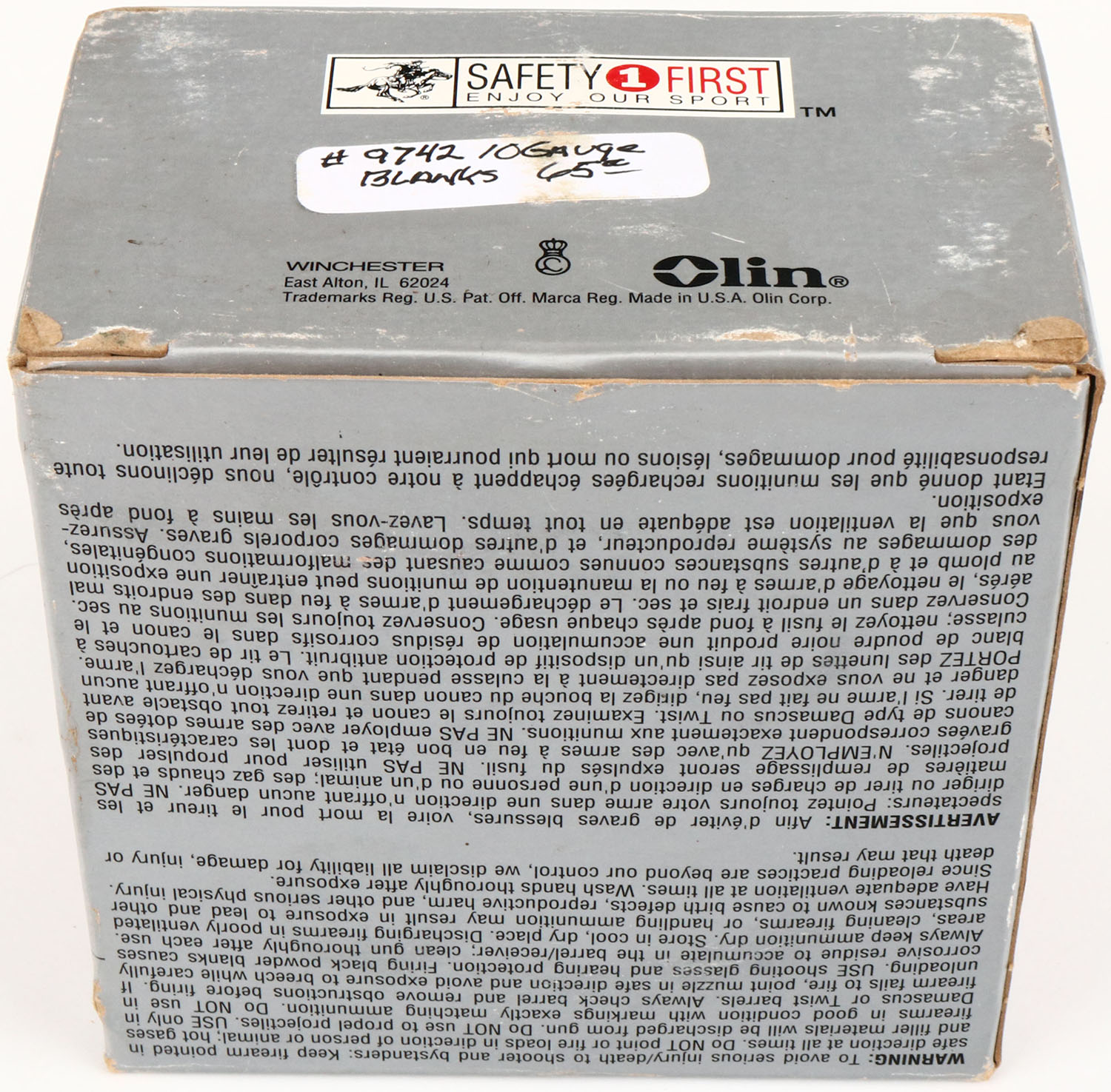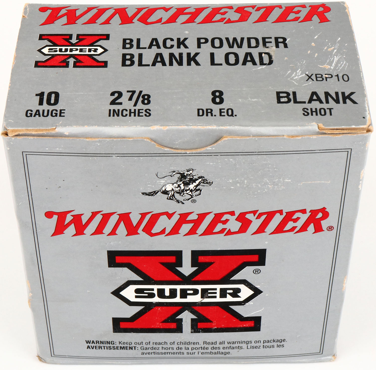 Winchester, Super-X Black Powder, 10ga., 1pc., Full, 2 7/8'', shot size Blank, multi colored box, box has great colors, shells are fair. Grade: Excellent - Value: 10 to 30