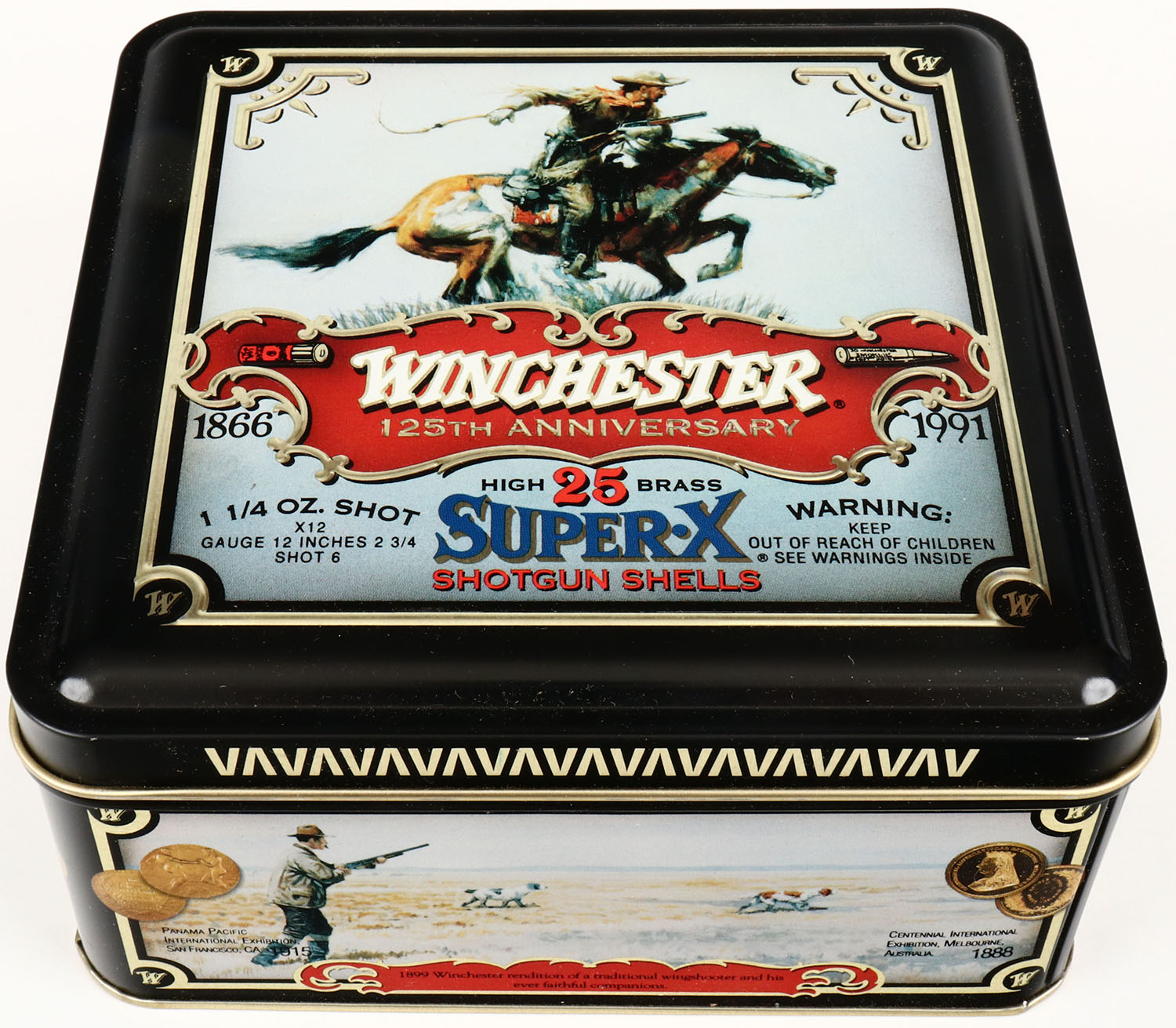 Winchester, Super-X 125th ANNIVERSARY, 1866-1991, 12ga., 2pc., FULL, 25 count metal tin. Grade: MINT - Value: 20 to 100