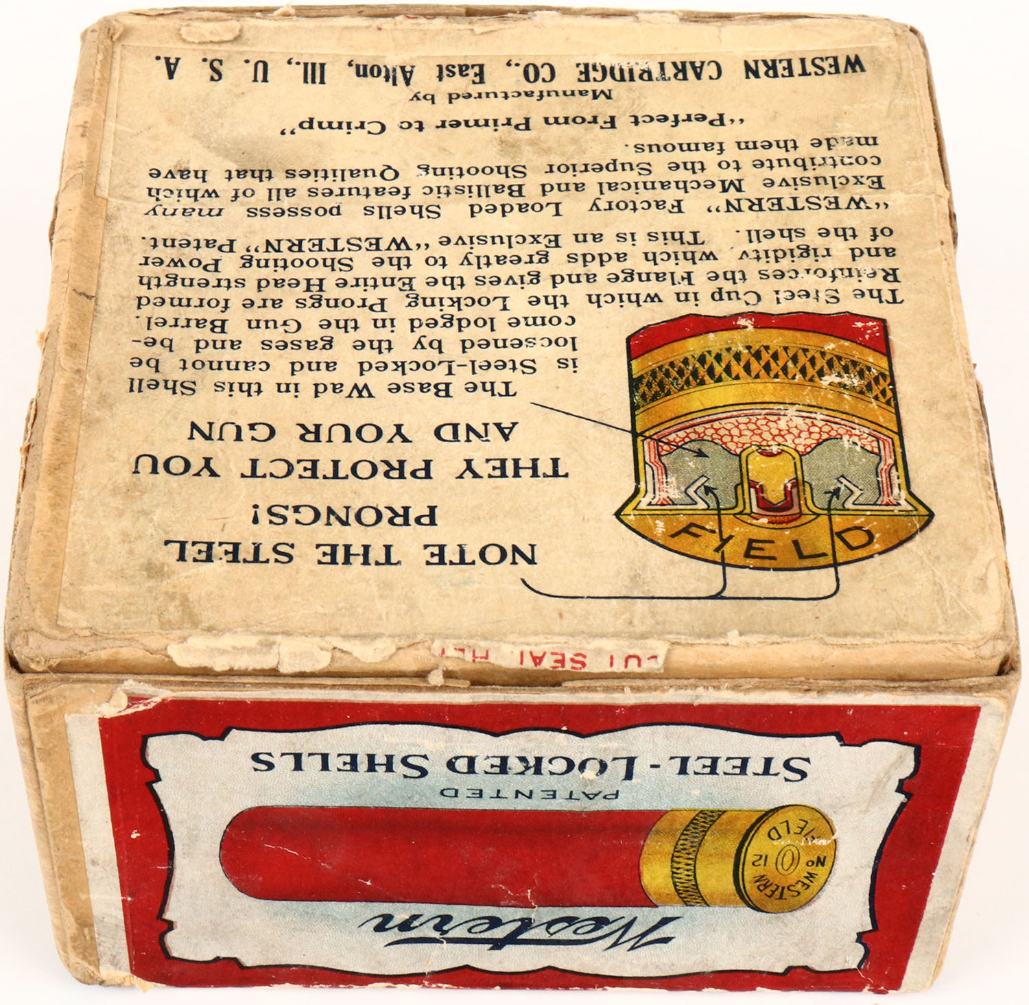 Western, Field/Super X, Label was made during transition from Field boxes to Super X boxes. 16ga., 2pc, Empty, shot size 5 Chilled, box has light age soiling, scuffing & tape repair with good label. Grade: Very Good ++ - Value: 50 to 150