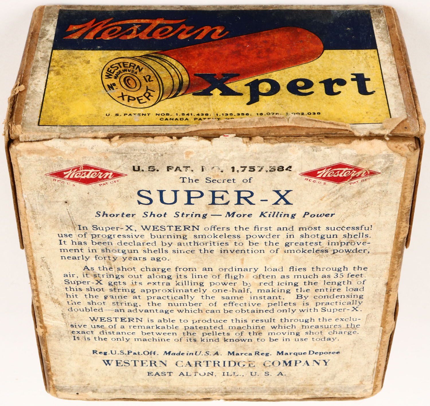 Western Cart. Co., Xpert, has Super-X bottom, 12ga., 2pc., Empty, blue, yellow & red box with a dog on point, Loading: No. 2 Shot, box has age soiling with nice colors. Grade: Very Good ++ - Value: 20 to 100