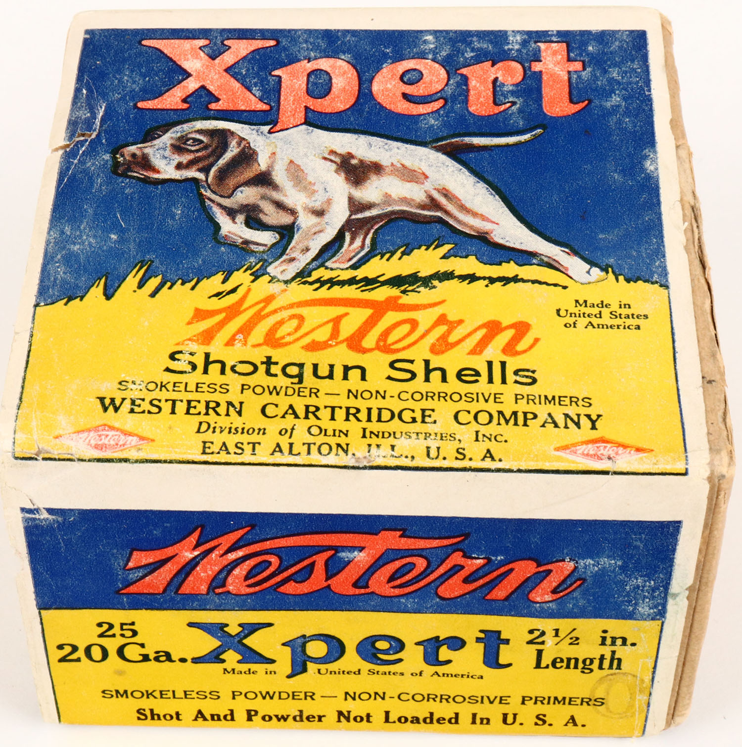 Western, Xpert, 20ga., 2pc., Full, Shot Size (not loaded in the USA) ? Shot, 2 1/2in., buff box with blue & yellow paper label that pictures the pointer, box has seam split, shell protrusions, label isn't glued to box but is solid with light scuffing to top label, label is 100% intact. Grade: Excellent - Value: 50 to 200