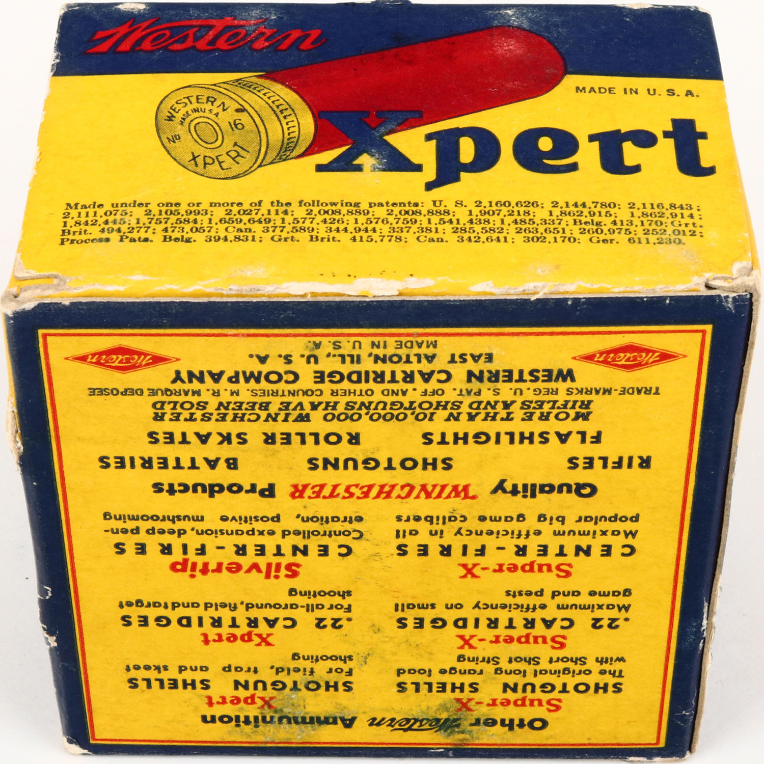 Western, Xpert, 16ga., 2 9/16'', 1pc., Full of Record 1 Buck, shot size 1 Buckshot, yellow, blue & red box, box is solid with light soiling, shell protrusions, and great colors, shells are excellent. Grade: Excellent - Value: 10 to 30