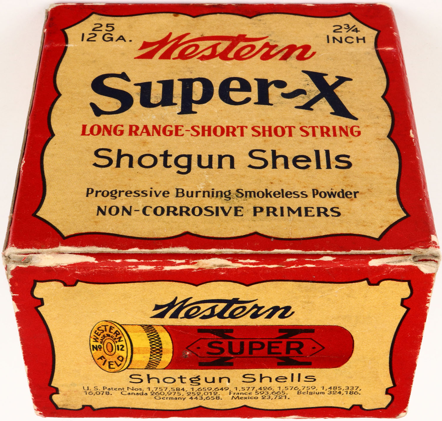 Western Cart. Co., Super X, 2 3/4'', 12ga., 1pc., Empty, 7 1/2 Chilled Shot, red, buff & black box, box is solid with very nice colors, box has light edge wear. Grade: Very Good ++ - Value: 20 to 40