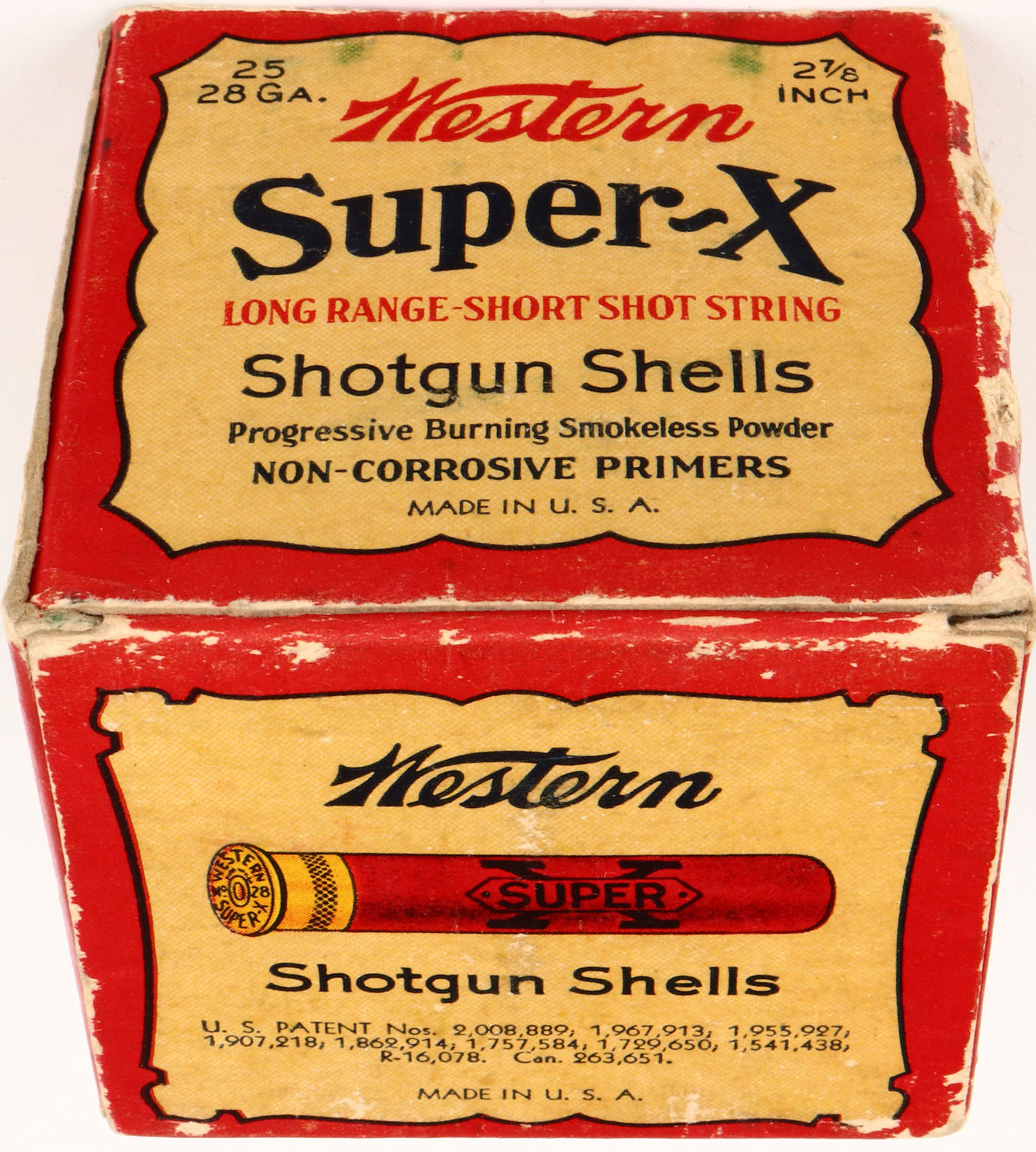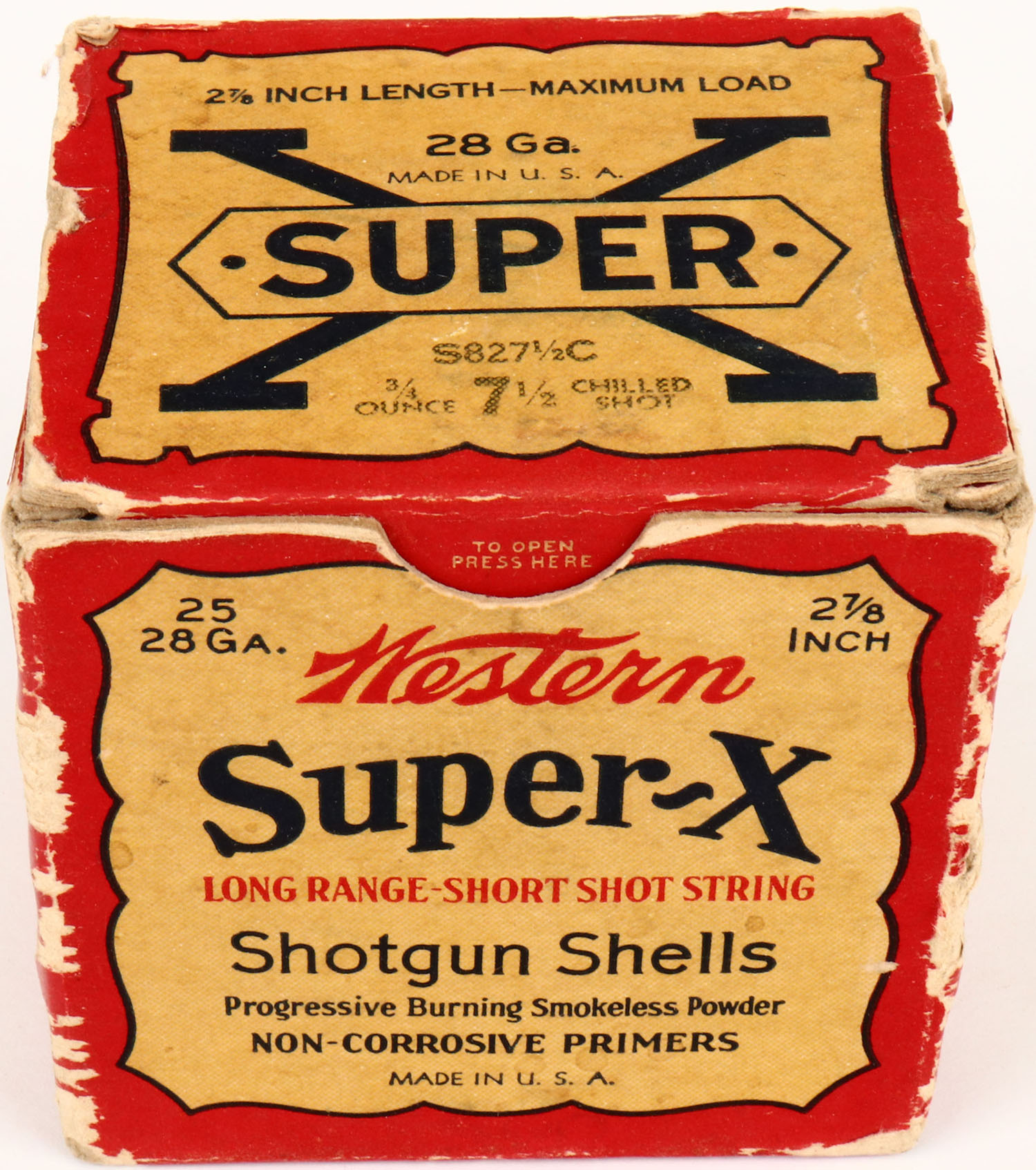 Western Cart. Co., Super X, 2 7/8'', 28ga., 1pc., Full, 7 1/2 Chilled Shot, red, buff & black box, box is solid with edge wear, and nice colors, Shells are very good. Grade: Very Good ++ - Value: 30 to 100