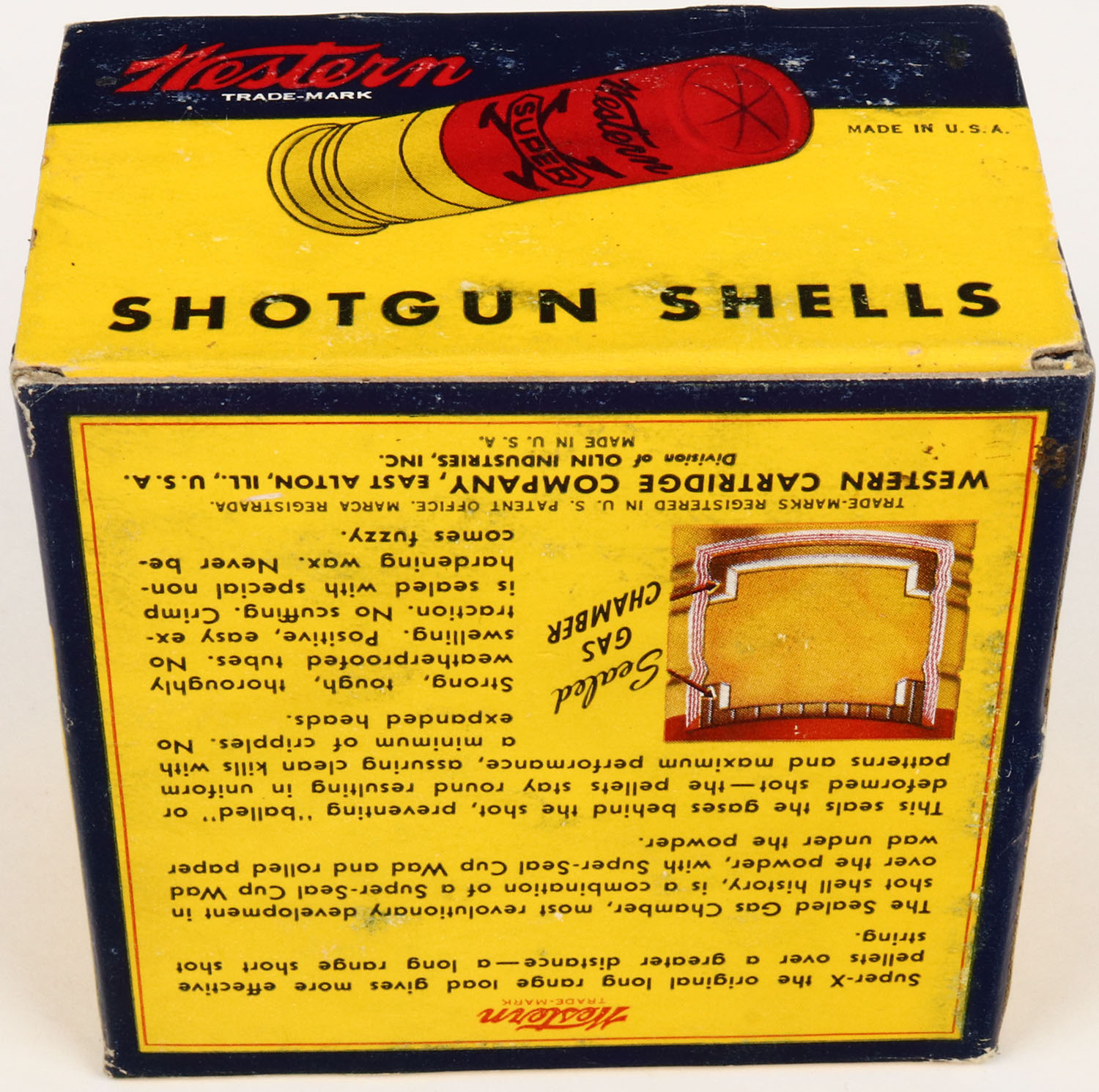 Western, Super X, 12 ga., 2 3/4'', 1pc., Full, shot size 8 Lubaloy, yellow, blue & red box, box is solid with light soiling, shells are excellent. Grade: Excellent + - Value: 10 to 30