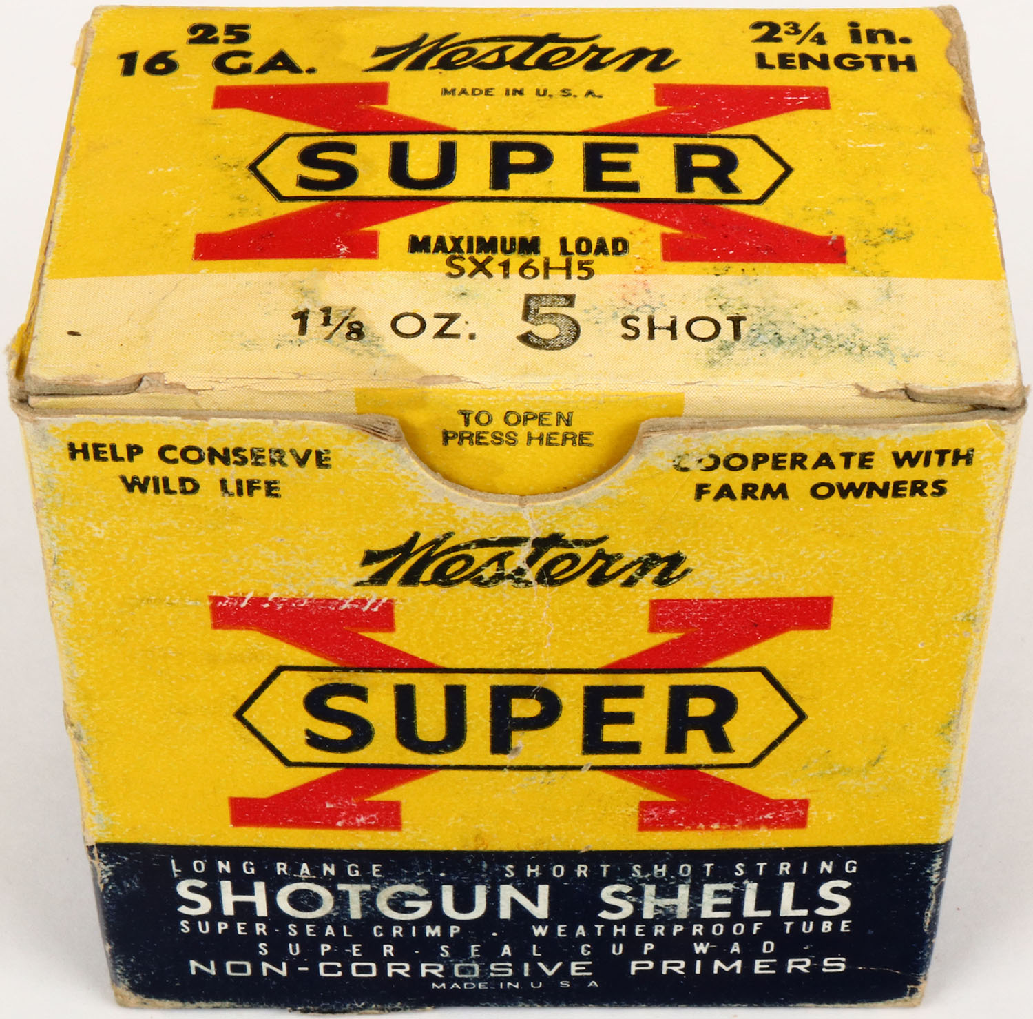 Western, Super X, 16 ga., 2 3/4'', 1pc., Full, shot size 5, yellow, blue & red box, box is solid with light soiling and light scuffing to bottom, shells are very good. Grade: Excellent - Value: 10 to 30