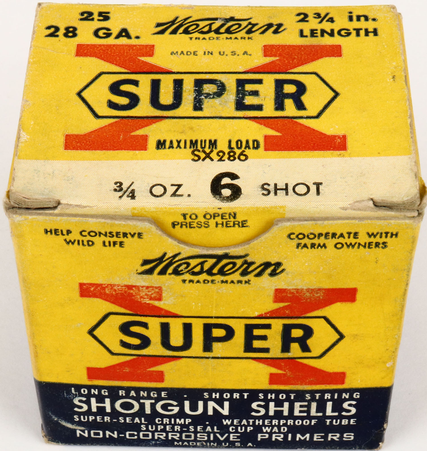 Western, Super X, 28 ga., 2 3/4'', 1pc., Full, 6 Shot, yellow, blue & red box, box is solid with light age soiling, shells are excellent. Grade: Very Good ++ - Value: 16 to 30