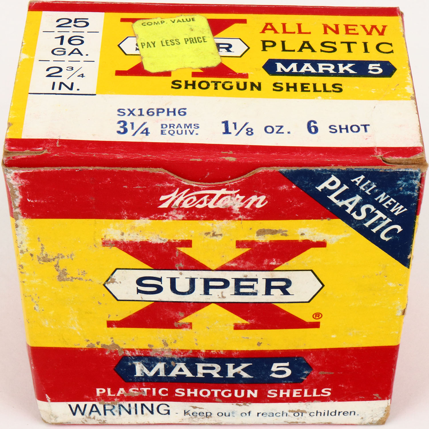 Western, Super X Mark 5, 16 ga., 2 3/4'', 1pc., Full, shot size 6, yellow, blue & red box, box is solid with scuffing, shells are very good. Grade: Very Good ++ - Value: 10 to 30