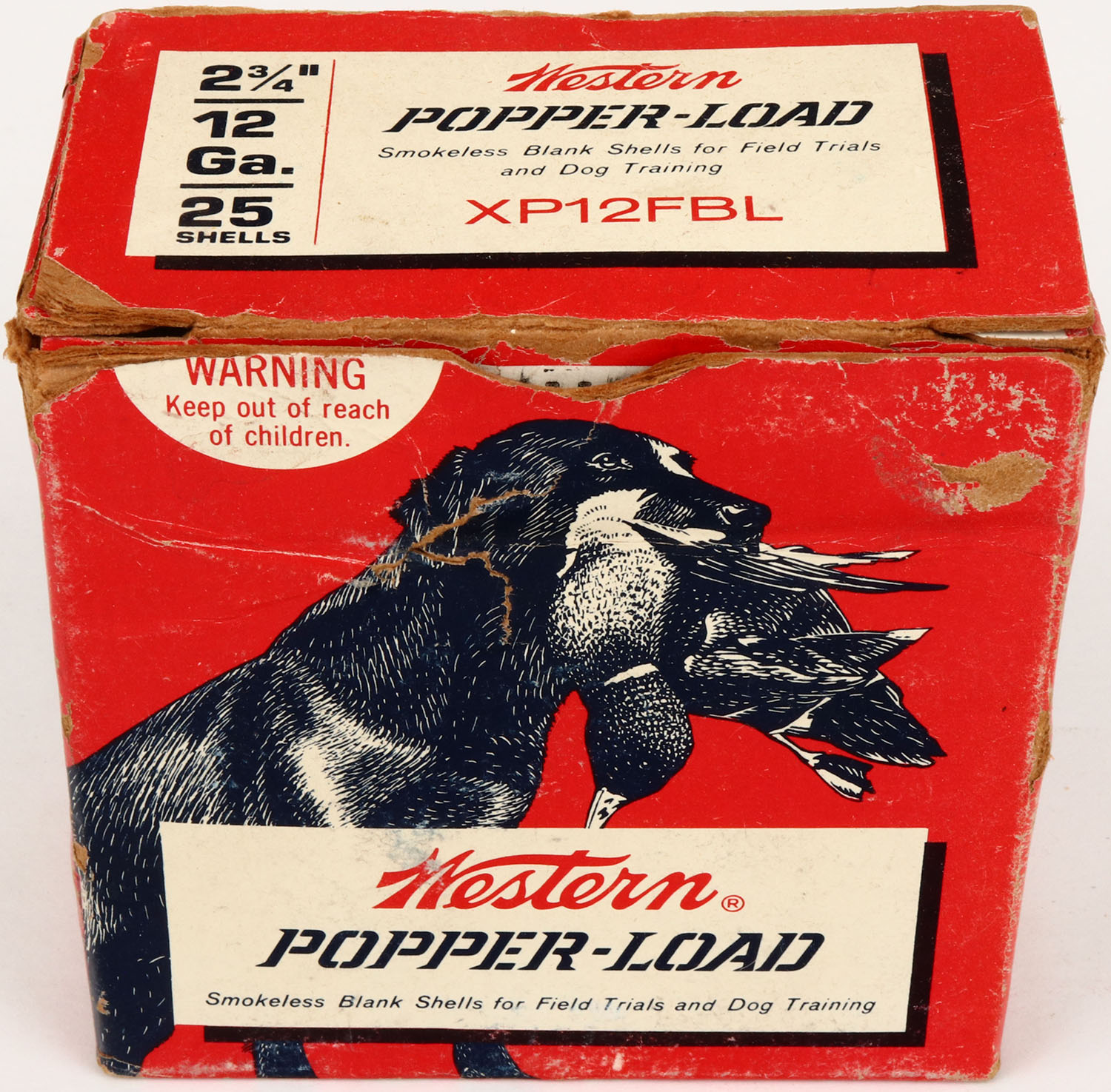 Western, POPPER-LOAD, 12ga., 1pc., Full, red, white & blue box, made for training dogs, nice box with top flap disconnected. Grade: Very Good ++ - Value: 20 to 50