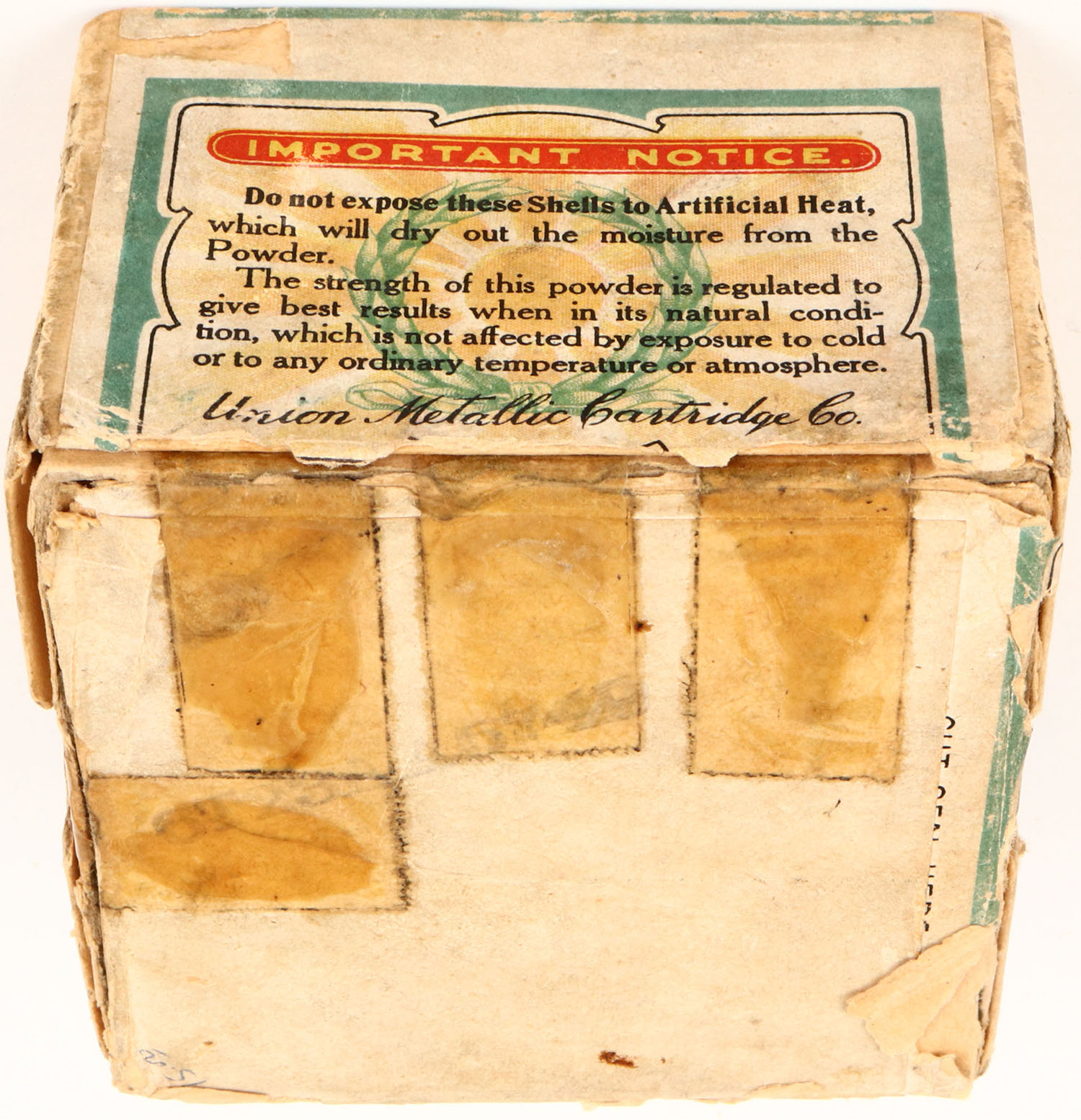 U.M.C. Nitro Club, 28 GAUGE, 2pc., Partial 19rds with one being incorrect shot size, shot size 8, buff box with sunburst logo & Mallard flying on top, bottom piece of box is almost disconnected, has light age soiling with tape repairs and very good color to label. Grade: Very Good ++ - Value: 70 to 250