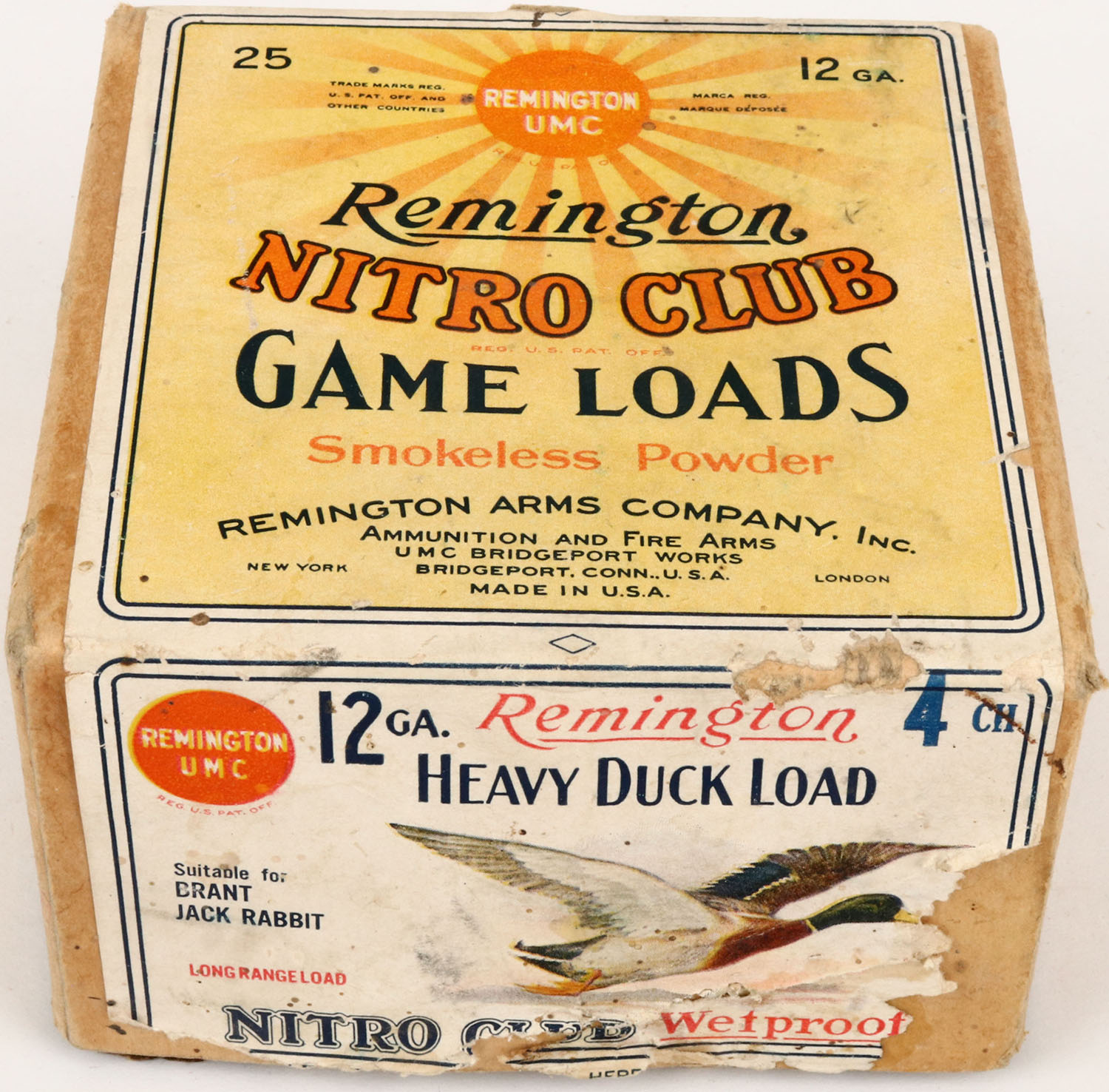 Remington Nitro Club, Game Load, 12ga., 2pc., Empty, shot size 4CH, buff box with sunburst logo & Mallard in flight on side, box has shell protrusions, seam split, and light age soiling, bottom box is incorrect. Grade: Excellent - Value: 50 to 100