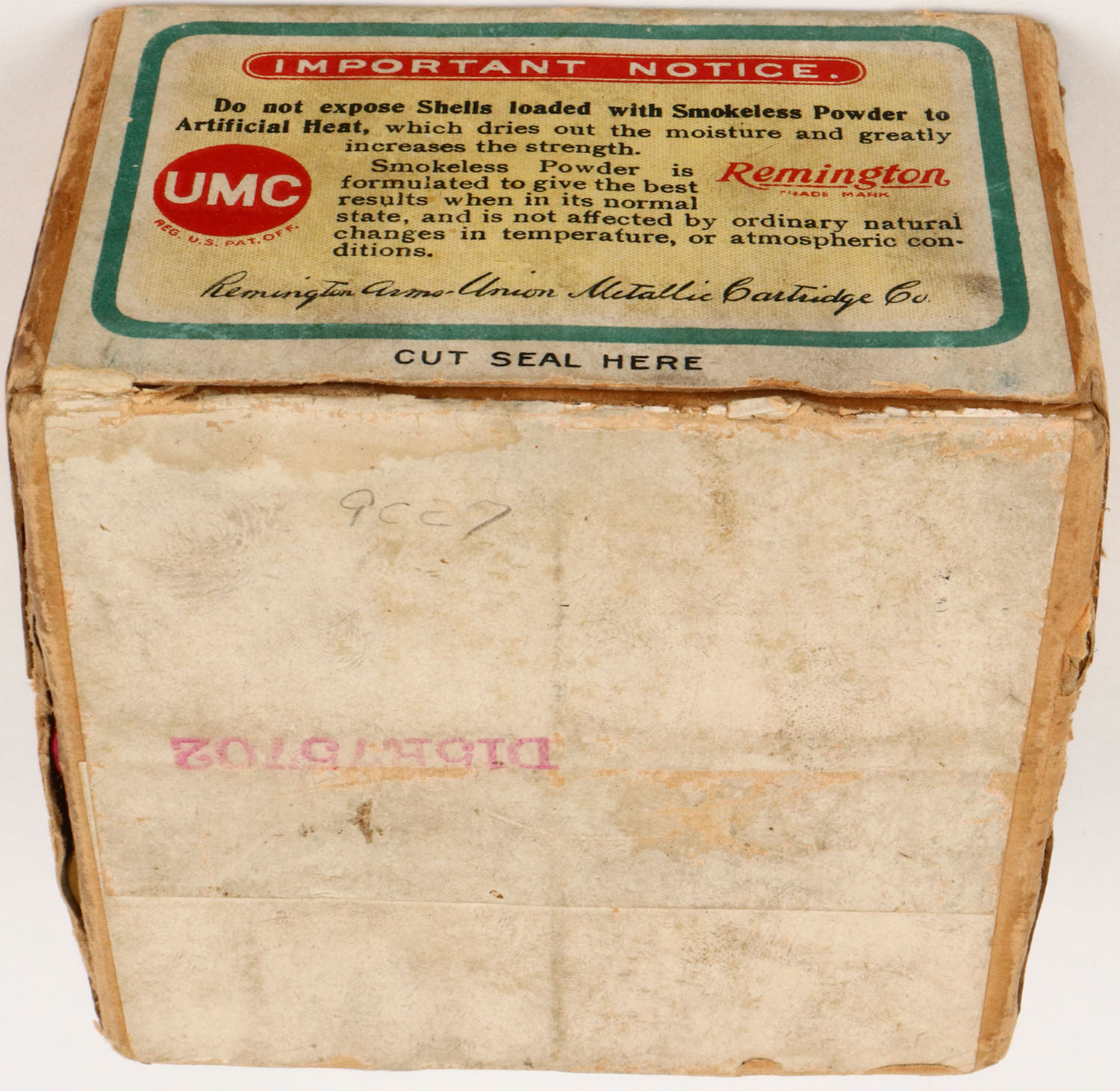 REM U.M.C. Nitro Club, 12 GAUGE, 2pc., Full, shot size 7 1/2 CH, buff box with sunburst logo & Mallard flying on top, has very nice color to label, box has seam split with shell protrusions and light age soiling, shells are excellent. Grade: Excellent - Value: 70 to 200