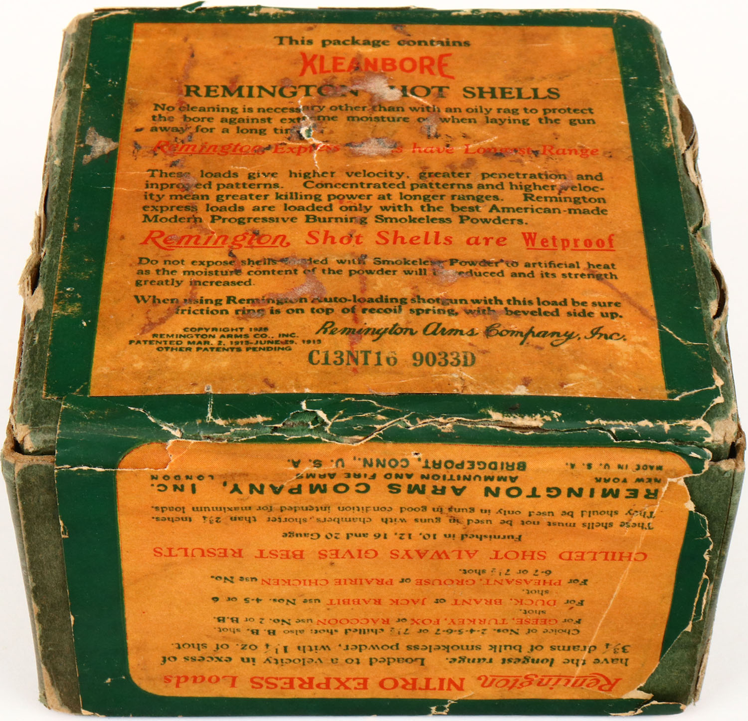 Remington Nitro Express, Long Range Game Loads, pictures Mallard in flight, 12ga., 2pc., Full, shot size 4CH, green box with sunburst logo & MALLARD on side, box has seam splits, age soiling and very nice colors to label. Grade: Very Good + - Value: 50 to 200