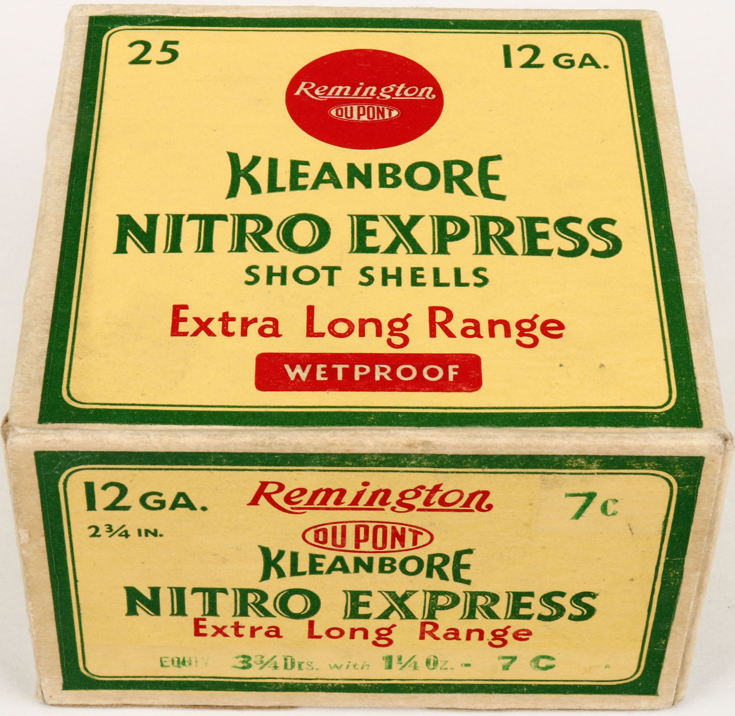 Remington, Kleanbore, NITRO EXPRESS, 12ga., 1pc., Full, shot size 7C, box is yellow, red and green, box is solid with very nice colors, shells are very good. Grade: Very Good ++ - Value: 10 to 30