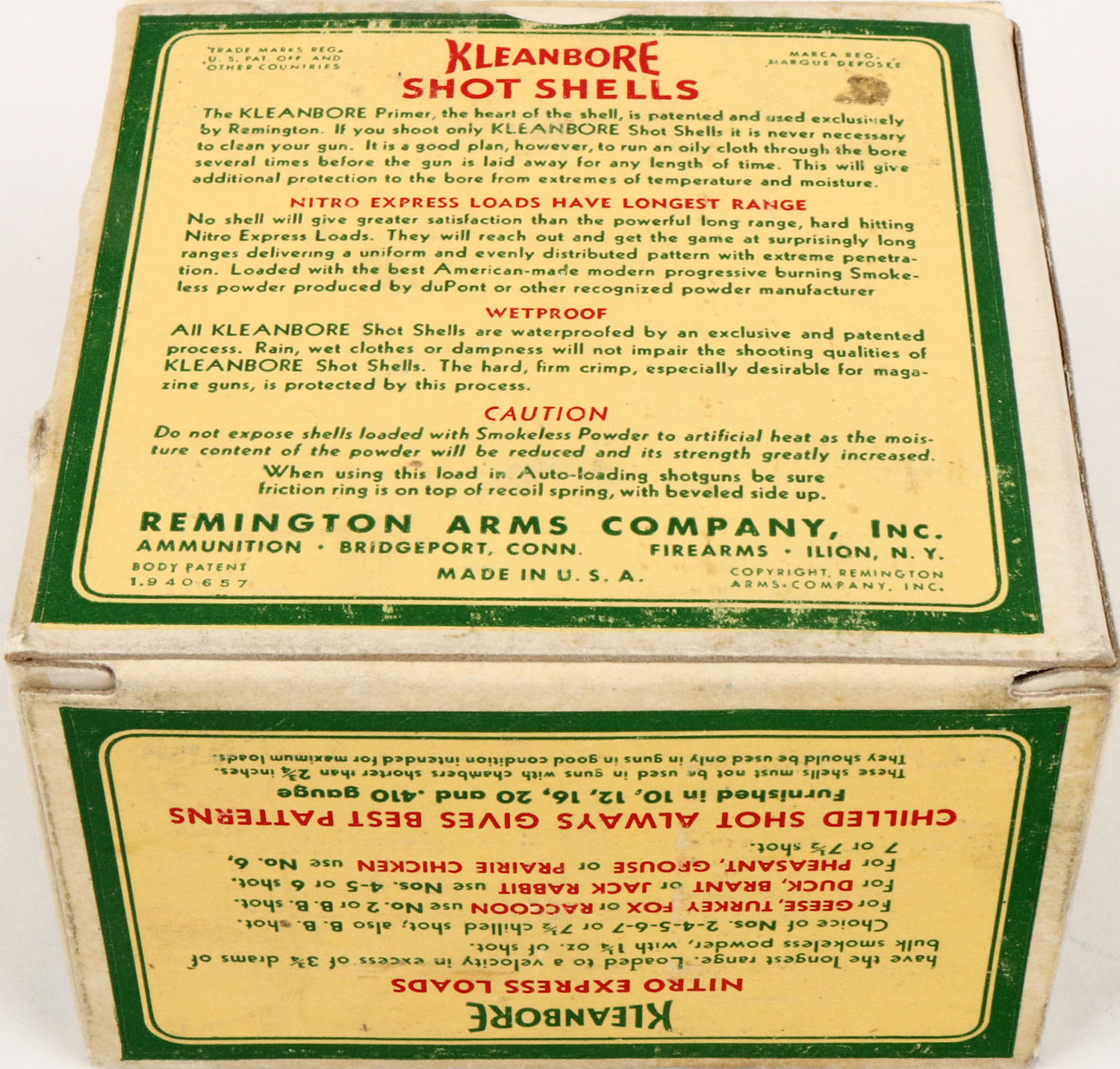 Remington, Kleanbore, NITRO EXPRESS, 12ga., 1pc., Full, shot size 7C, box is yellow, red and green, box is solid with slight shell protrusions, great colors, shells are excellent. Grade: Excellent + - Value: 10 to 50