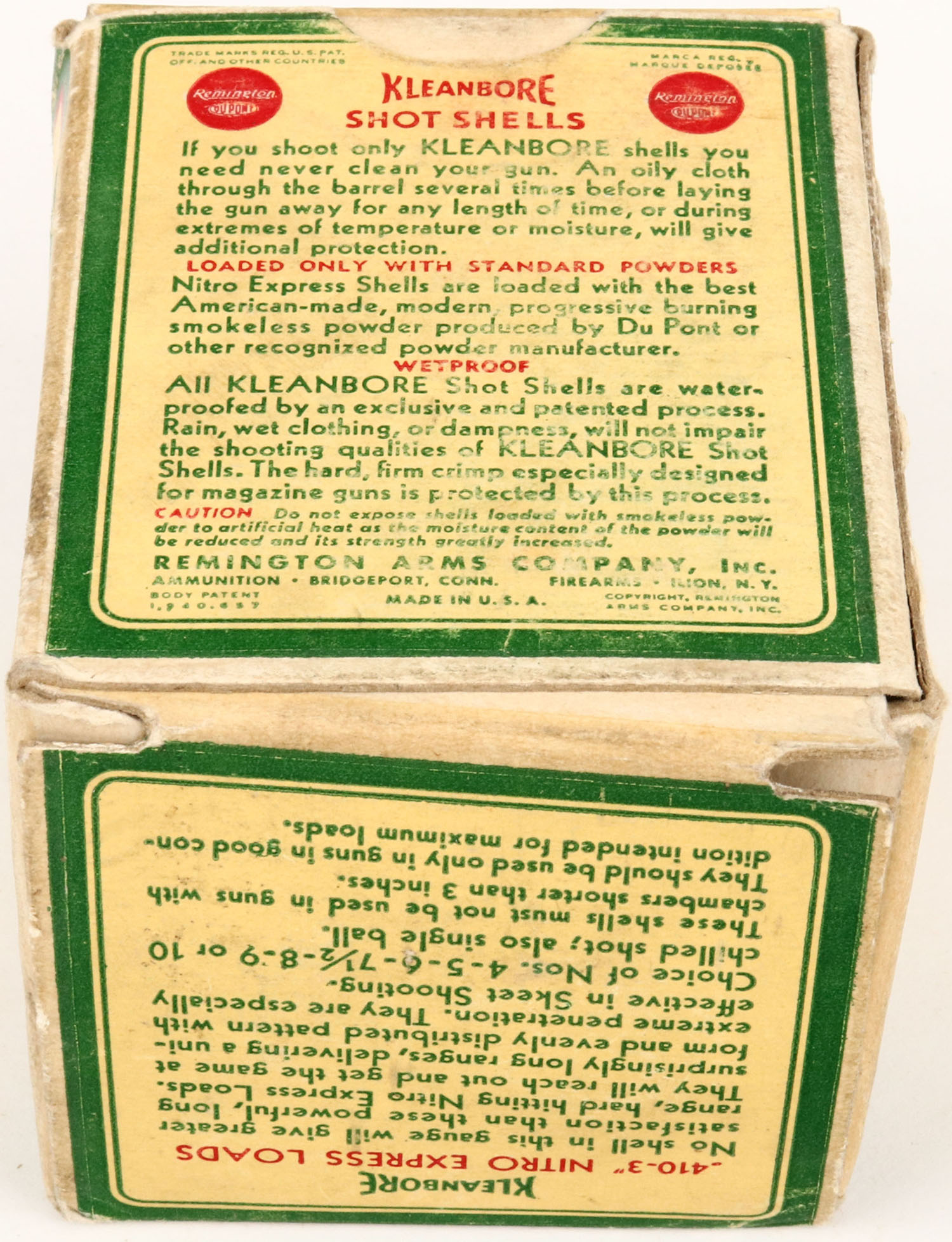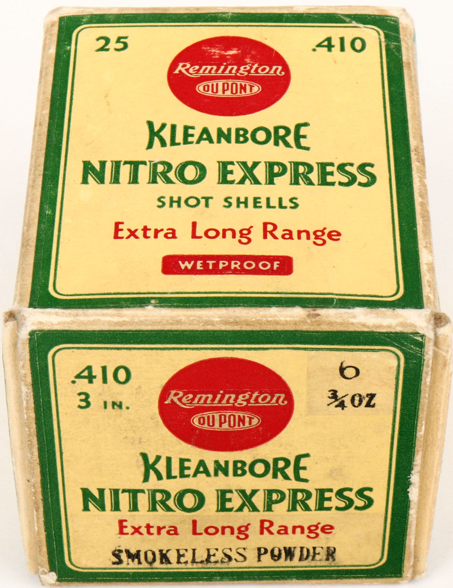 Remington, Kleanbore, NITRO EXPRESS, 410ga., 1pc., Full, shot size 6, box is yellow, red and green, box is solid with nice colors, shells are very good. Grade: Excellent - Value: 20 to 80