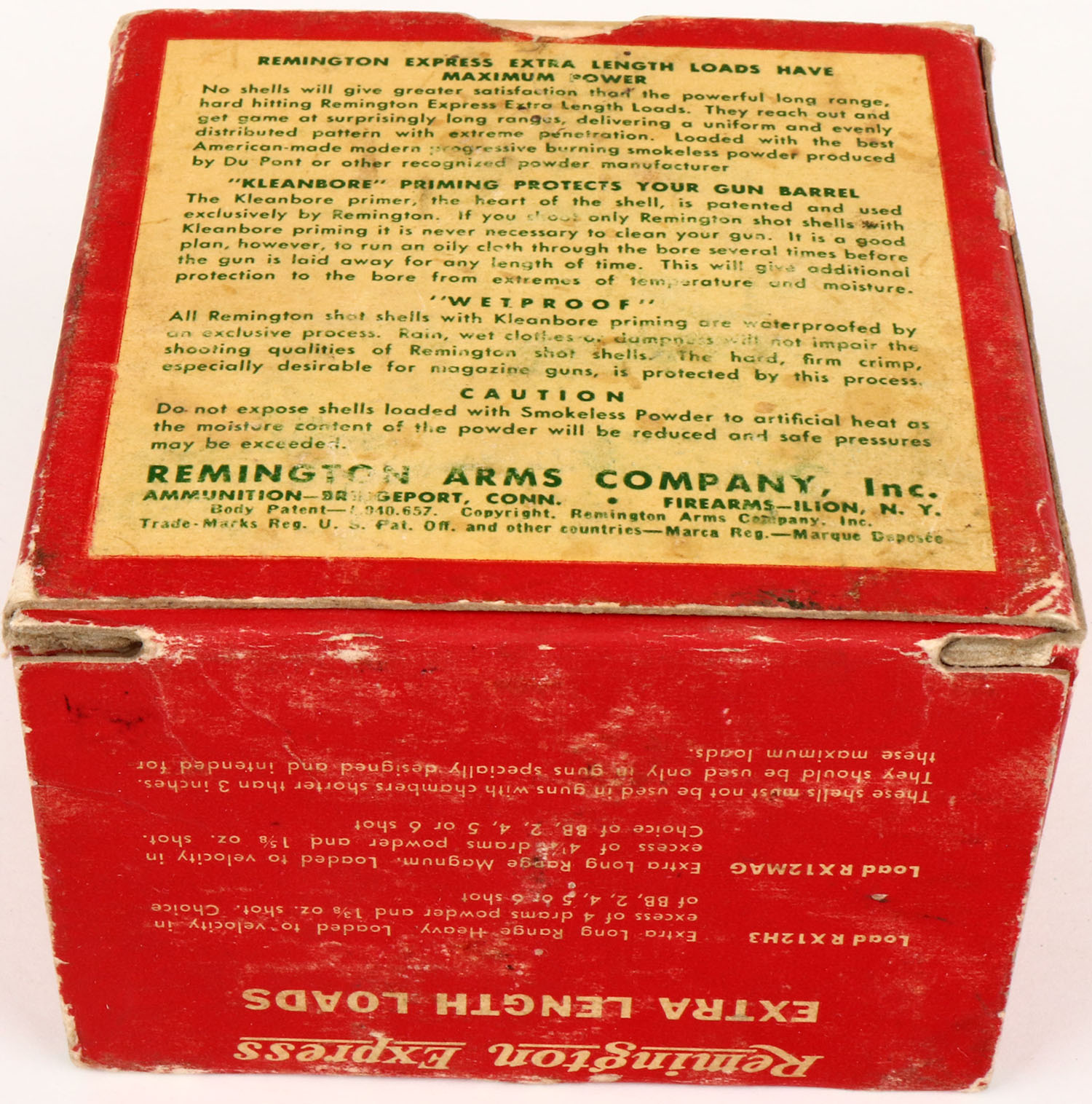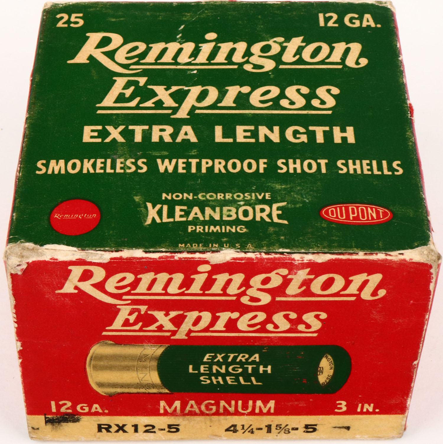 Remington, Kleanbore Express MAGNUM, 12ga., 1pc., Full, shot size 5, red, white and green box, 3'', box is solid with light soiling has very nice colors, & shells are excellent. Grade: Excellent - Value: 20 to 60
