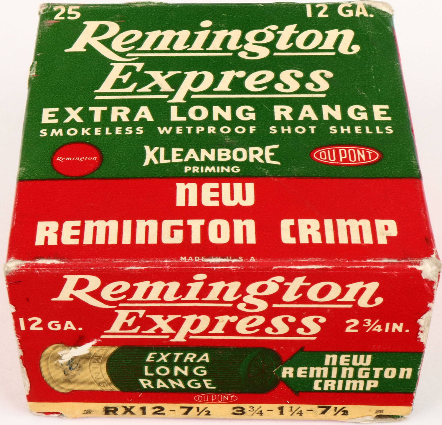 Remington, Express Extra Long Range, 12ga., 2 3/4'', 1pc., Full with six being incorrect shot size, shot size 7 1/2, box is red, white and green, box is very solid with great colors and light edge wear, shells are excellent. Grade: Excellent + - Value: 10 to 30