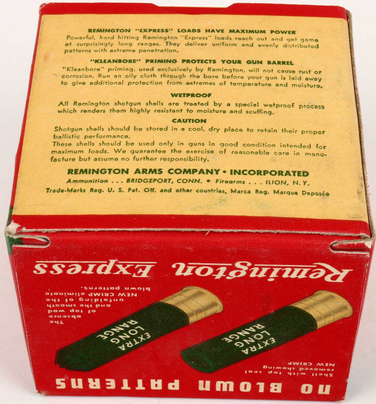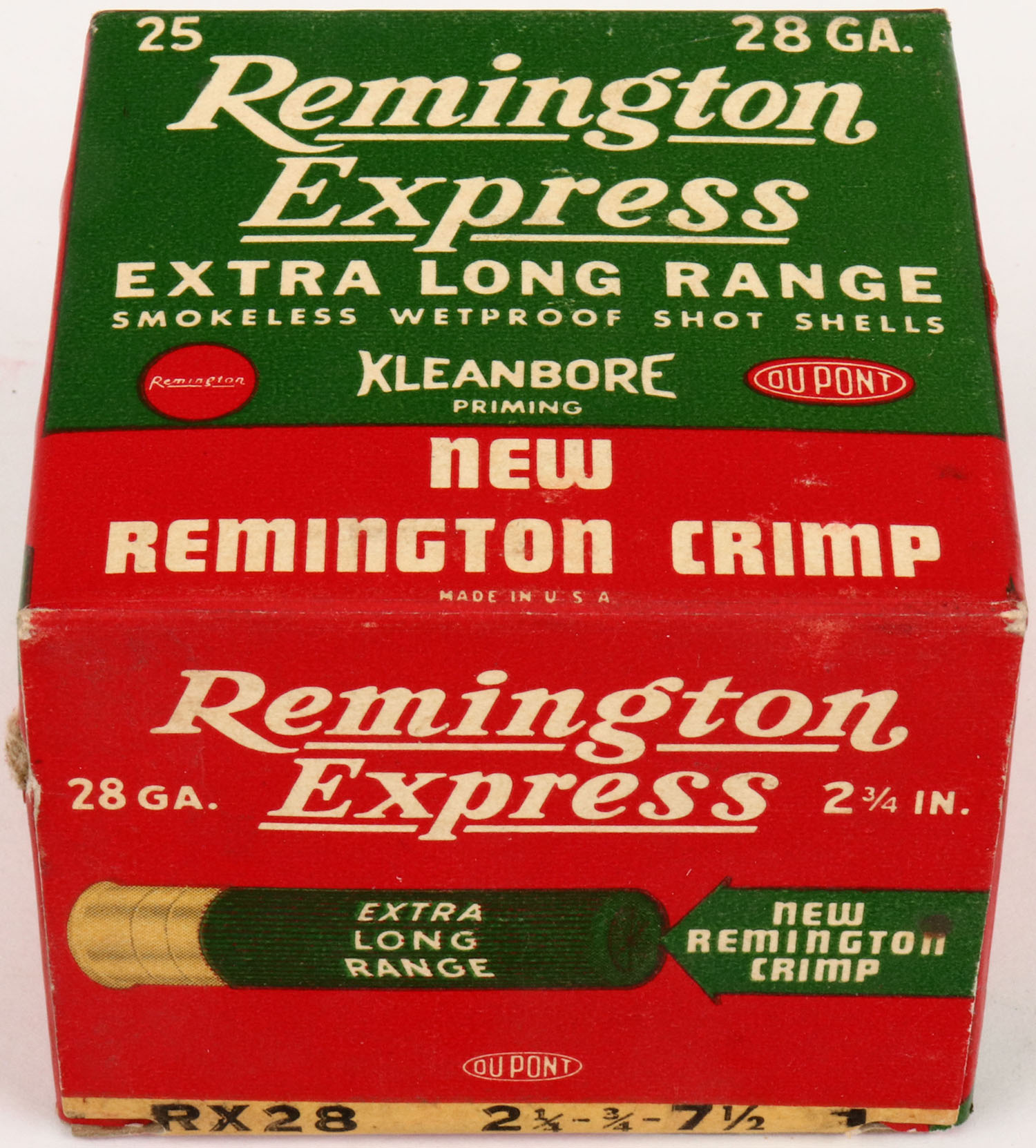 Remington, Kleanbore Express Extra Long Range, 28ga., 1pc., Full, shot size 7 1/2, red and green box, 2 3/4'', box is very solid, with great colors, shells are excellent. Grade: Excellent - Value: 20 to 40