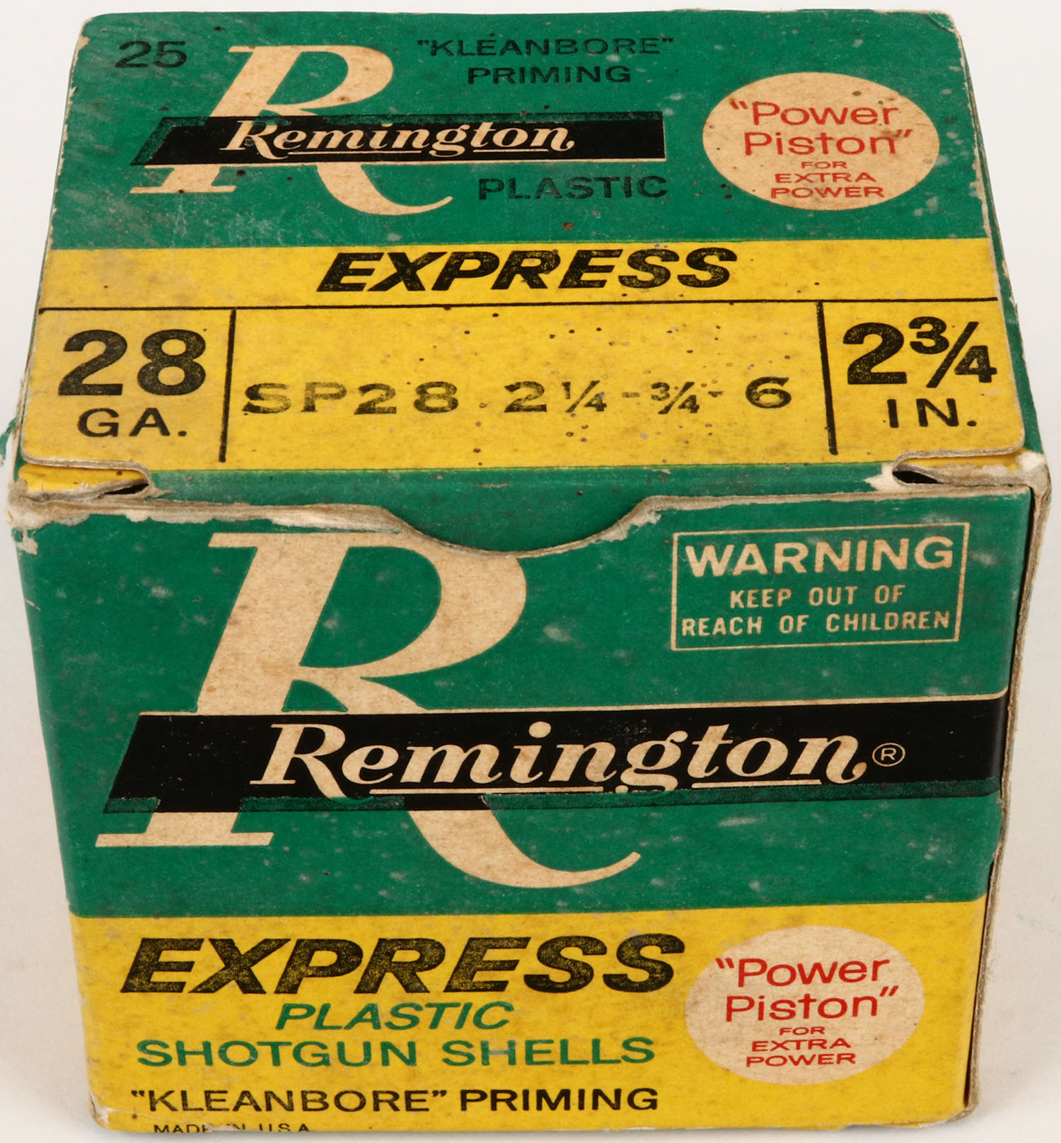 Remington, Express, 28ga., 2 3/4'', 1pc., Full, shot size 6, green, yellow & white box, box has good color with light age soiling, shells are very good. Grade: Very Good + - Value: 8 to 20