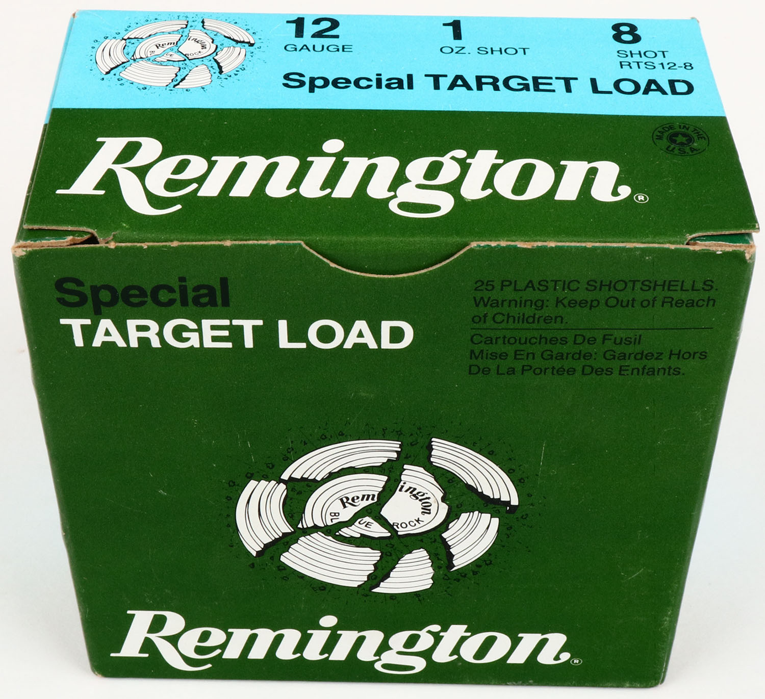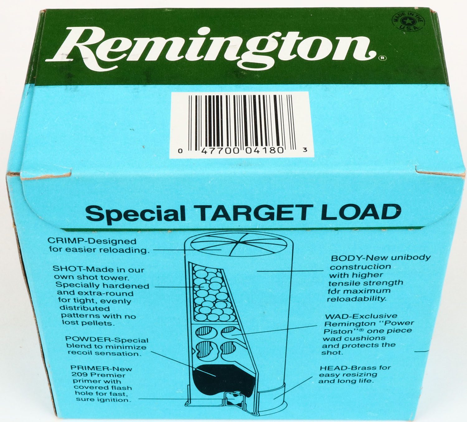 Remington, Special Target Load, 12ga., 2 3/4'', 1pc., Full, shot size 8, green, blue & white box, box has great color, shells are excellent. Grade: Excellent ++ - Value: 8 to 20