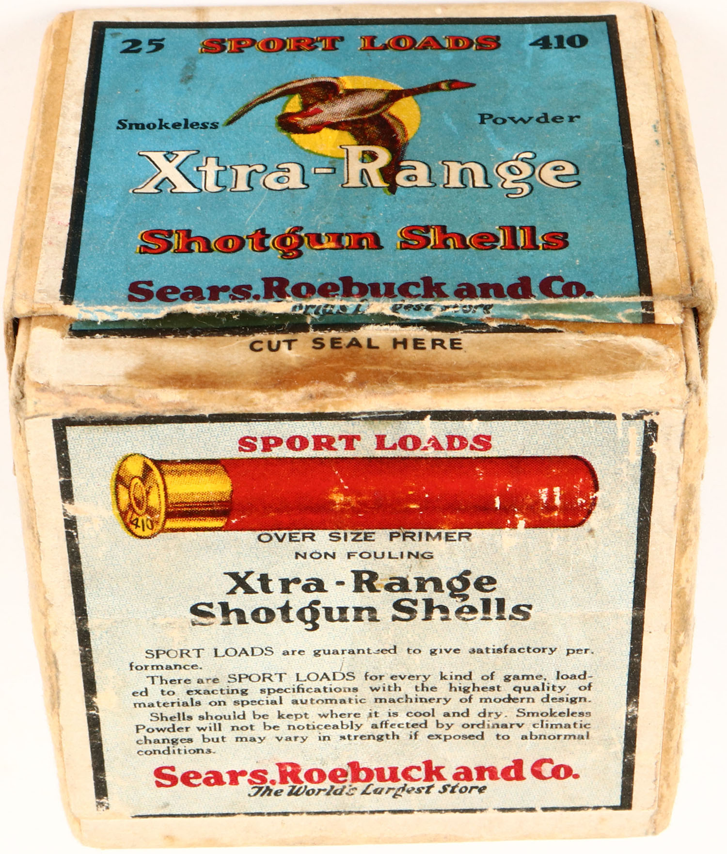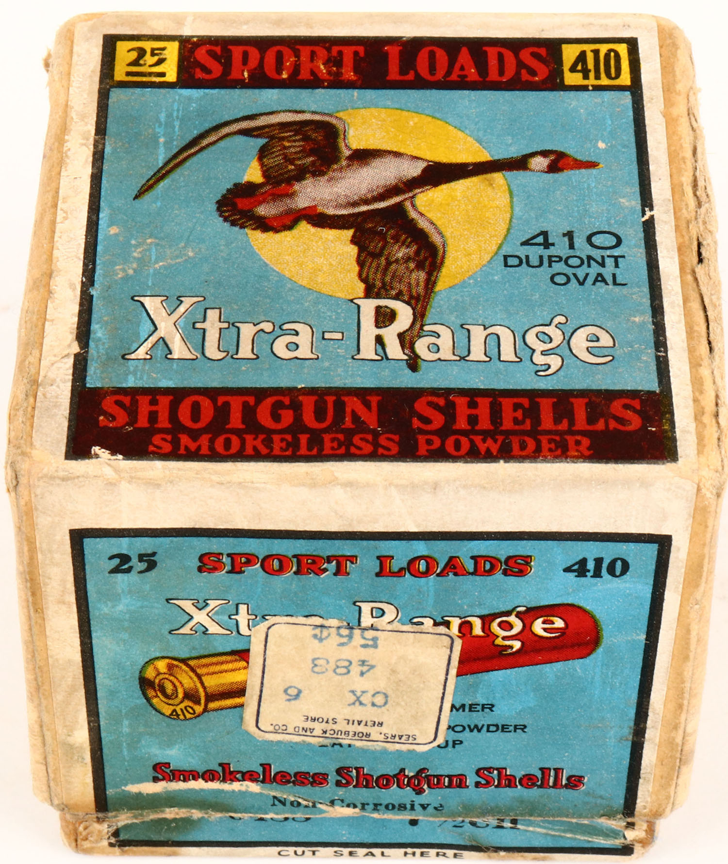 Sears, Sports Loads XTRA-RANGE, 410ga., 2pc., Partial 10rds, shot size 7 1/2ch, buff box with multi colored label that pictures a Goose flying with a yellow moon in background, box has seam split, light age soiling with very nice colors, Shells are excellent. Grade: Excellent - Value: 100 to 500