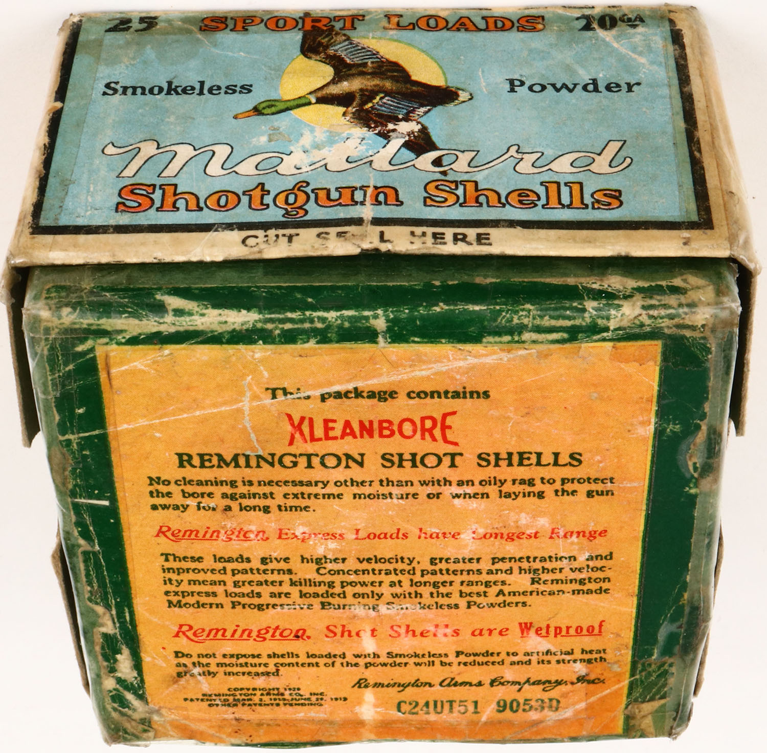 Sears, Sports Loads MALLARD, 20ga., 2pc., Partial 18rds all are incorrect brand, shot size 6, buff box with multi colored label that pictures a Mallard flying with a yellow moon in background, box has incorrect bottom box with tape repair, age soiling & nice colors, shells are very good. Grade: Very Good - Value: 20 to 40
