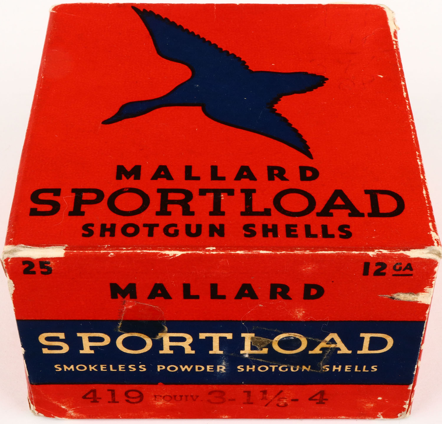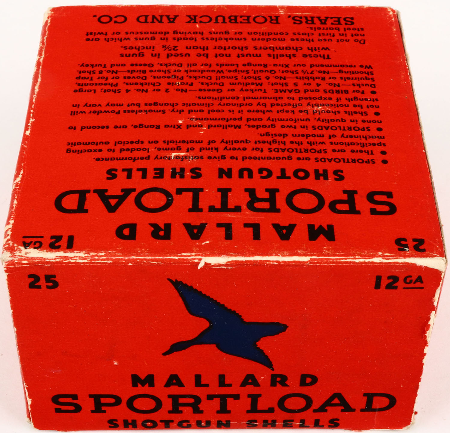 Sears, Sportload MALLARD, 12ga., 1pc., Full, shot size 4, red & blue box that pictures a Mallard in flight, box is solid with great colors and light edge wear, shells are very good. Grade: Excellent - Value: 30 to 100