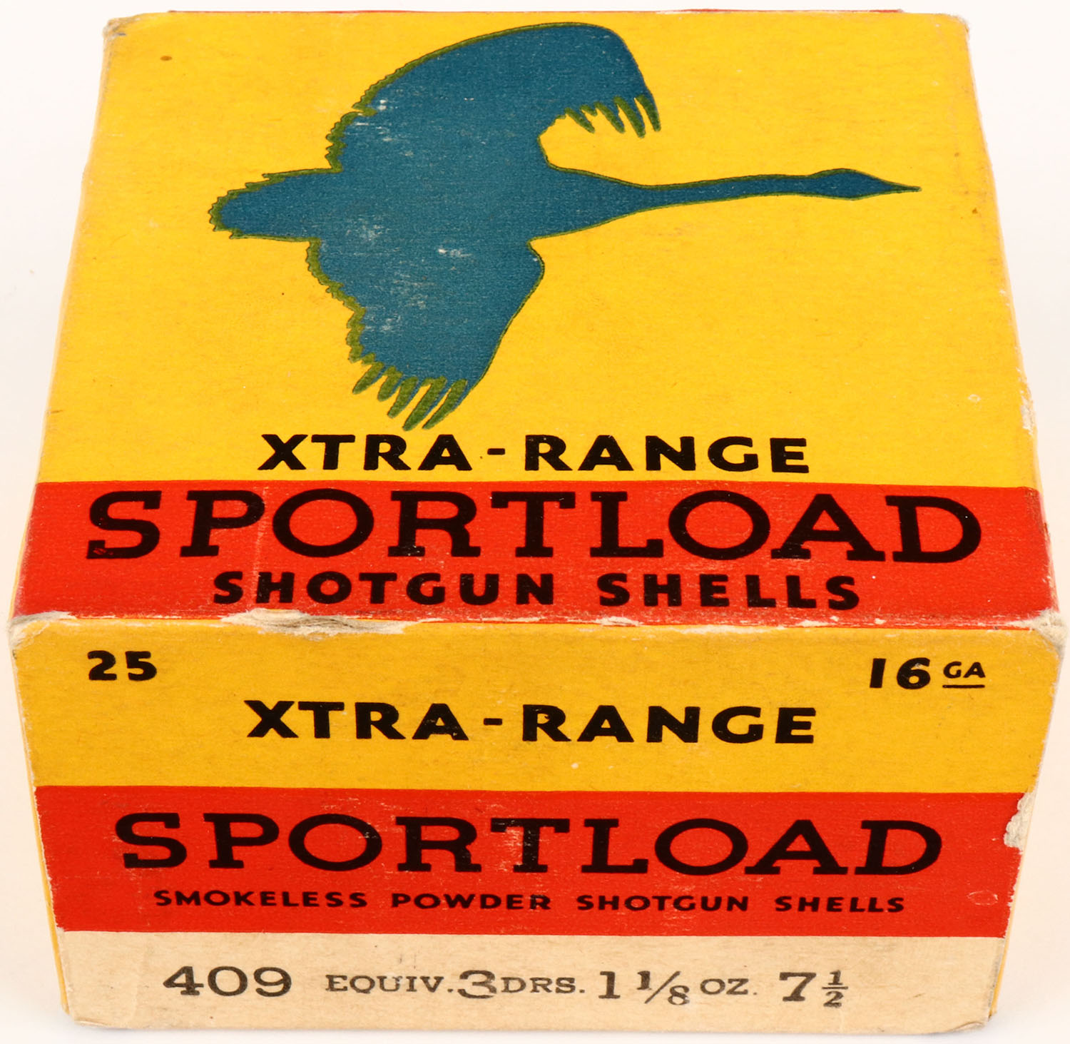 Sears, Sportload XTRA-RANGE, 16ga., 1pc., Full, shot size 7 1/2, yellow, red & blue box that pictures a Goose in flight, box has light edge wear, & great color. Shells are excellent. Grade: Excellent + - Value: 30 to 100