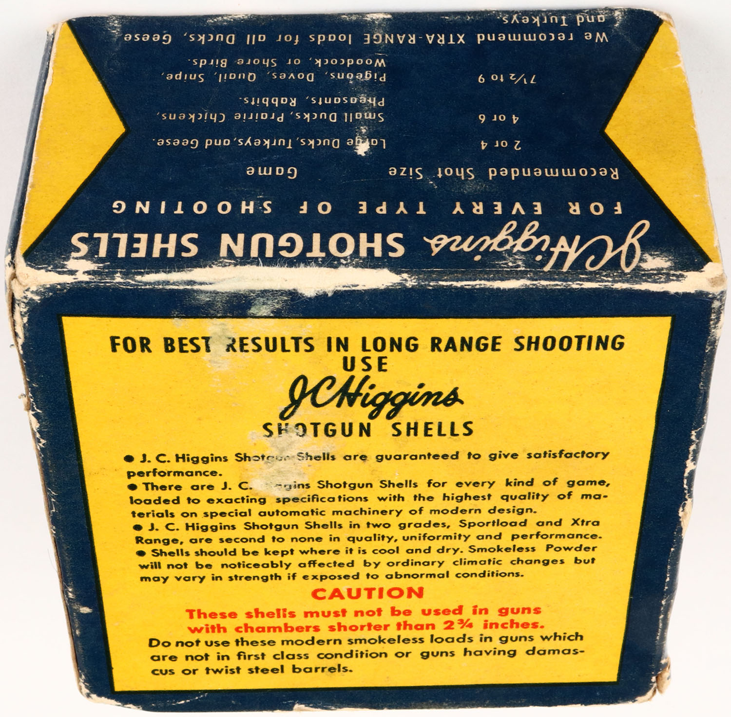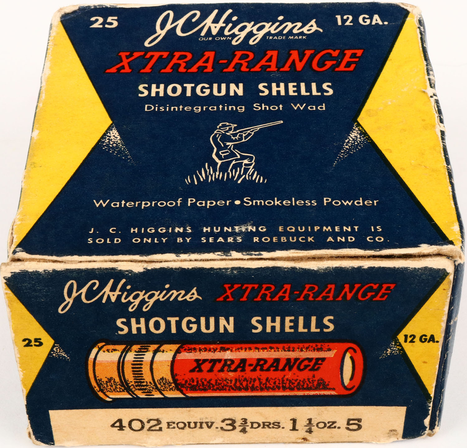 Sears, J.C. Higgins, Xtra-Range, 12ga., 1pc., Partial 14rds, shot size 5, multi-colored box, box bottom flap is disconnected with great color, edge wear & light scuffing, Shells are excellent. Grade: Very Good ++ - Value: 10 to 50