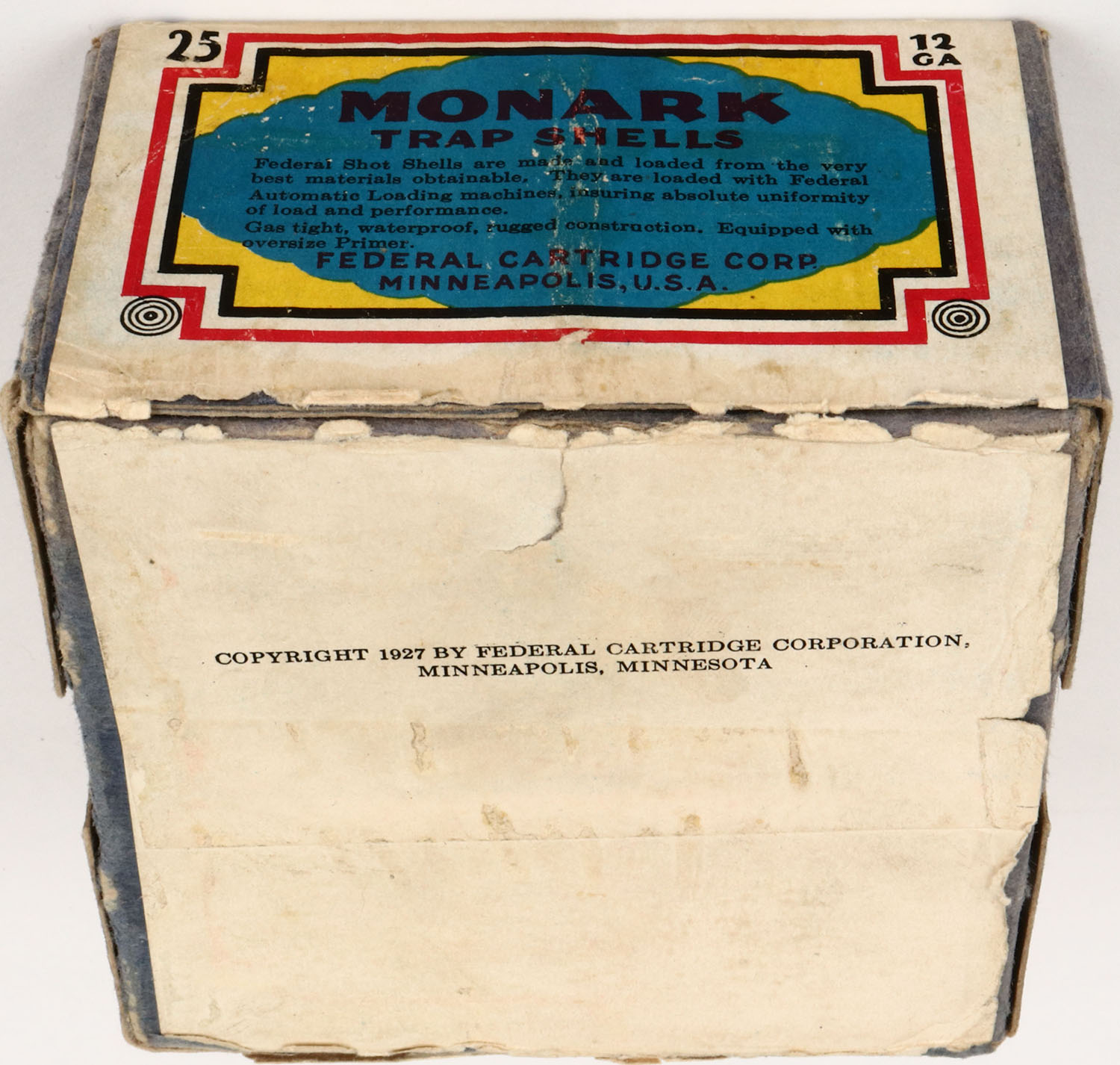 Federal, MONARK TRAP SHELLS, 12ga., 2pc., Empty, shot size 7 1/2ch, blue box with yellow, orange, red & black label, box has shell protrusions, seam splits with very nice label, RARE BOX, Grade: Very Good ++ - Value: 100 to 500