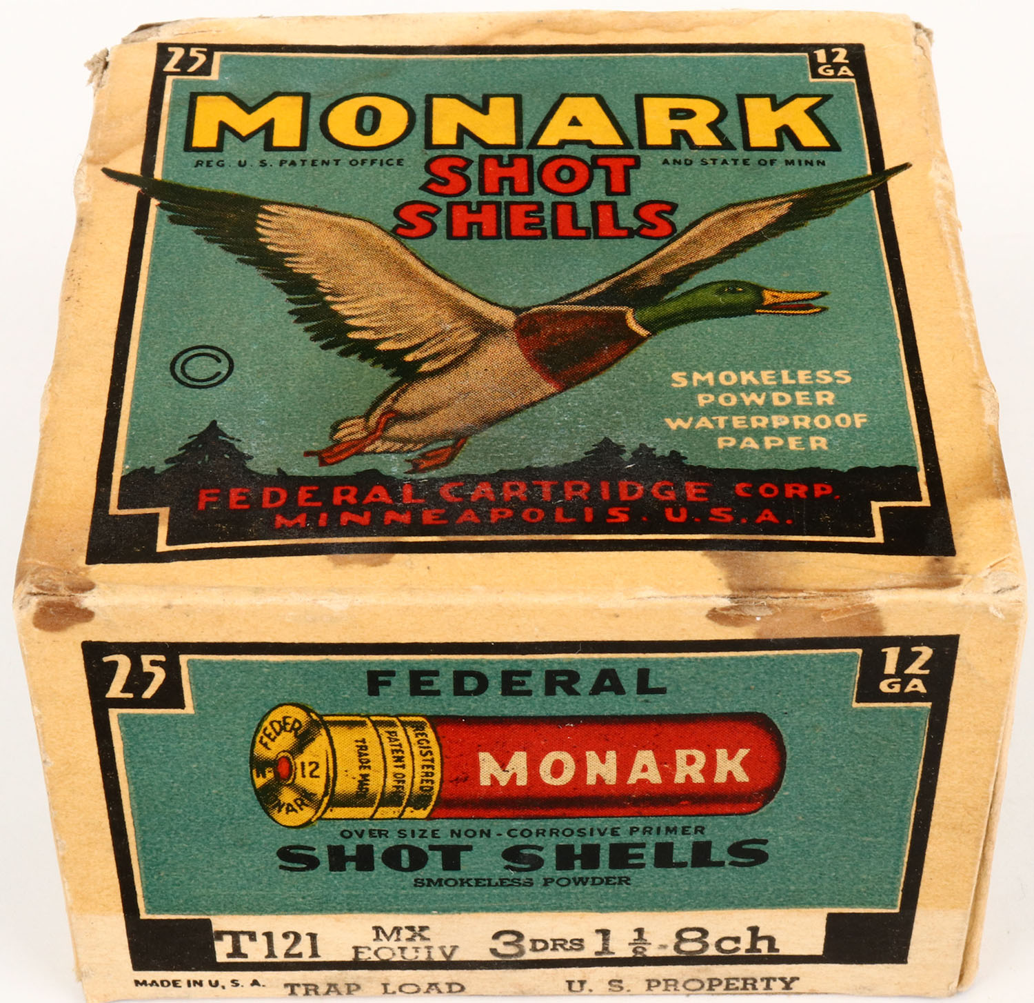 Federal Cart. Co., MONARK, U.S Property, 12ga., 1pc., Full, shot size 8ch, Black border, blue, yellow and red box with flying mallard, box has light shell protrusions, light age soiling, light scuffing, is solid with very nice color, shells are very good. Grade: Very Good ++ - Value: 16 to 40