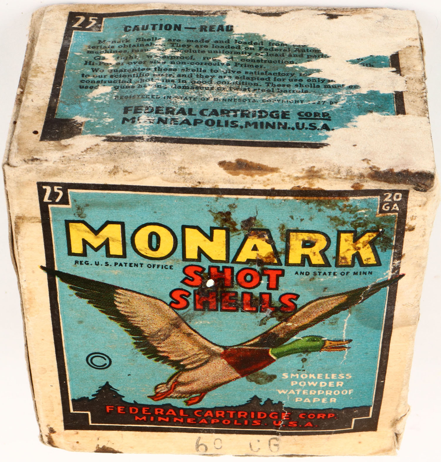 Federal Cart. Co., MONARK, 20ga., 1pc., Partial 18rds, shot size ?, Black border, blue, yellow and red box with flying mallard, box has no top flap, has shell protrusions, age soiling, scuffing, small tear with nice color, shells poor. Grade: Very Good - Value: 8 to 20