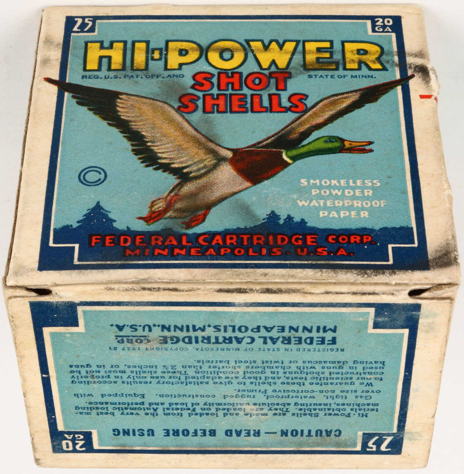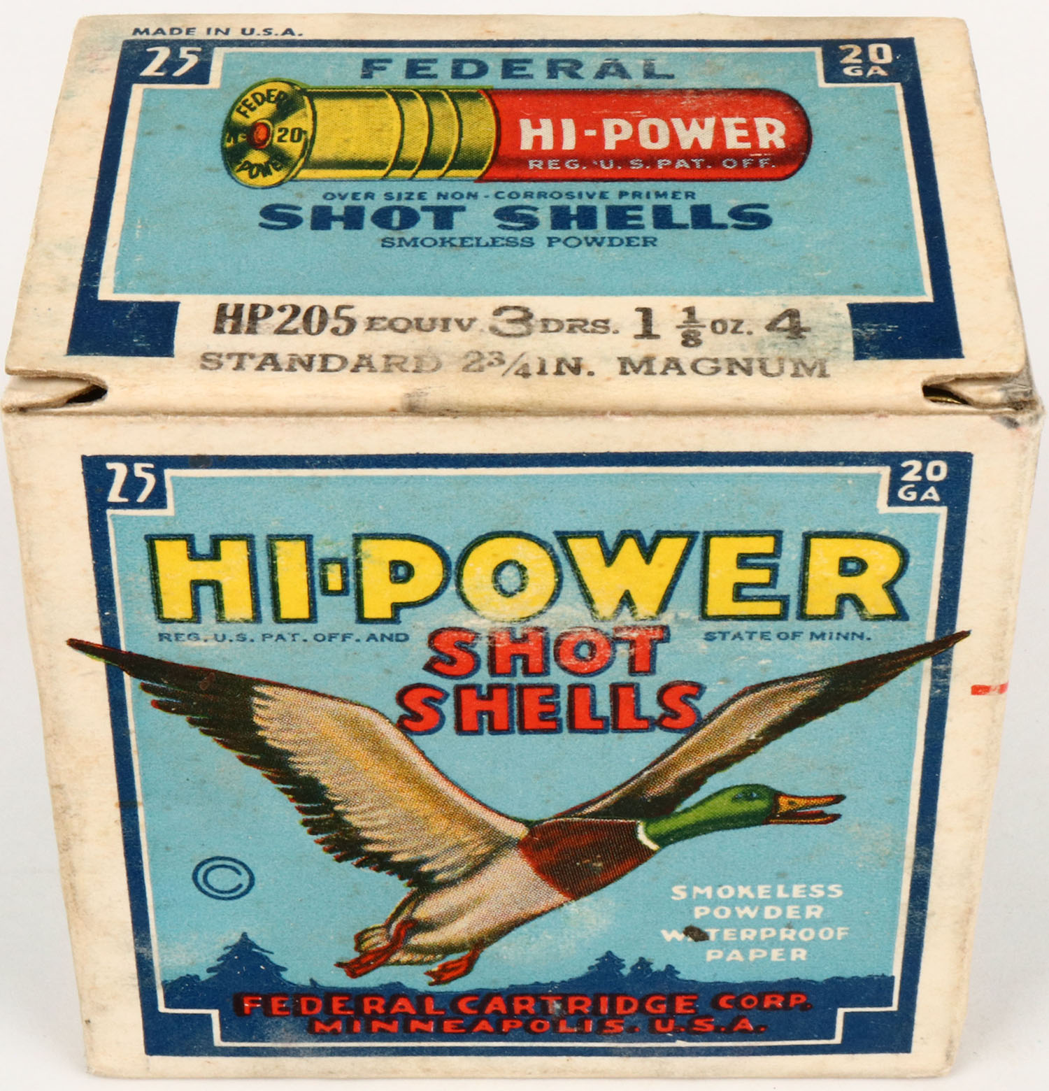 Federal Cart. Co., HI-POWER, 20ga., 1pc., Full, shot size 4 Magnum, Blue border, black, yellow and red box with flying mallard, box has light soiling, small shell protrusions, box is solid with very nice color, shells are excellent. Grade: Excellent - Value: 10 to 30