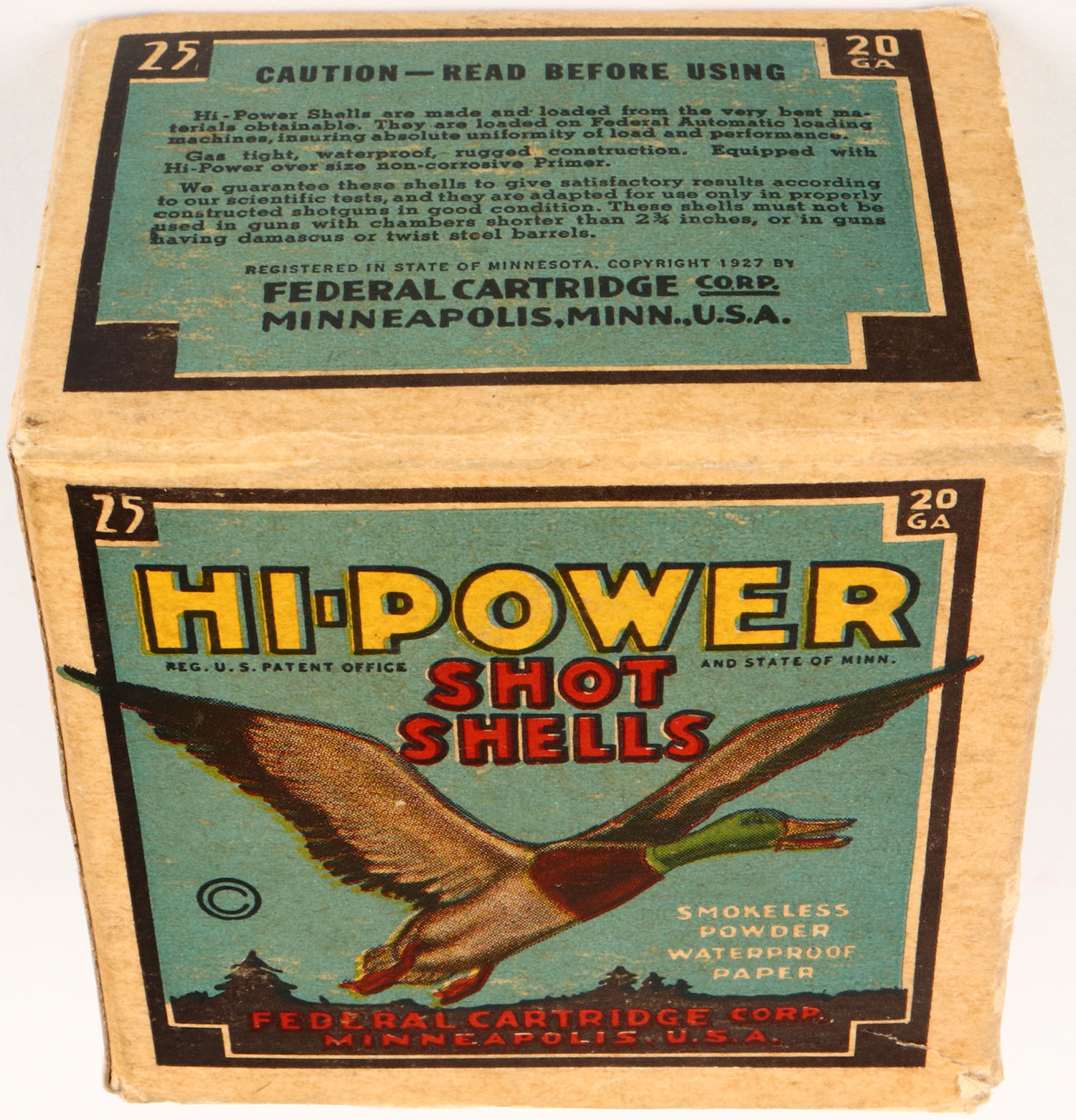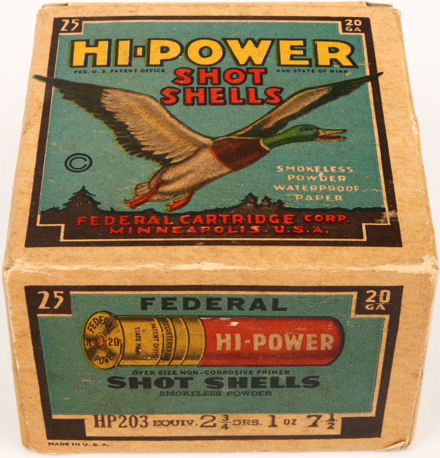 Federal Cart. Co., HI-POWER, 20ga., 1pc., Full, shot size 7 1/2, Black border, blue, yellow and red box with flying mallard, box is solid with very nice color, shells are excellent. Grade: Excellent - Value: 10 to 30