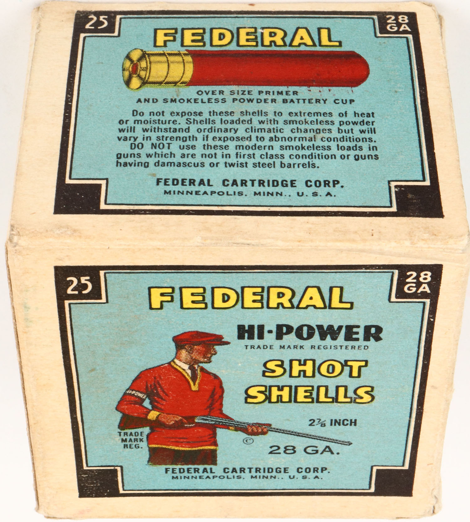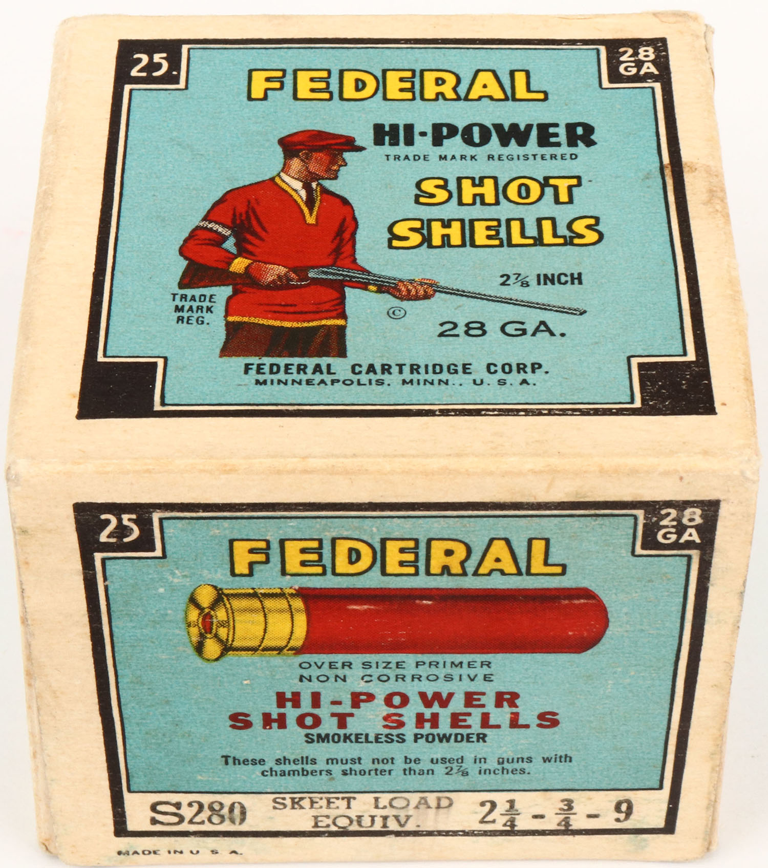 Federal Cart. Co., HI-POWER, 28ga., 1pc., FULL, shot size 9 Skeet Load, Black border, blue, yellow and red box that pictures trap shooter with red sweater & cap, box has tears to bottom & top inside flaps with great colors, shells are good. Grade: Excellent - Value: 20 to 50