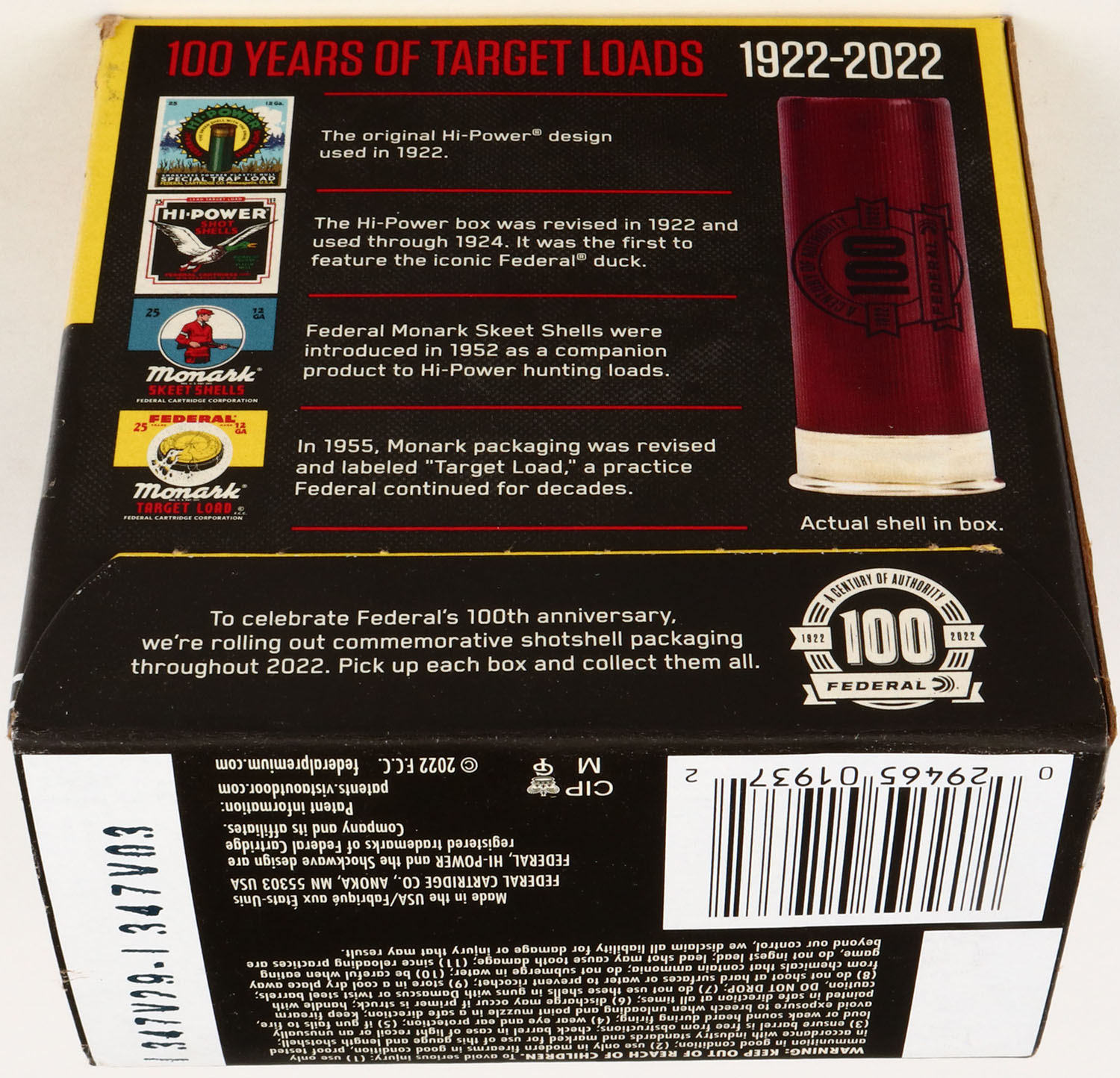 Federal Cart. Co., Monark 100 Year Anniversary, 12ga., 1pc., Full, shot size 8, black, yellow and red box with Trap that has shot all around, box very solid with Minty color box shows earlier boxes and when they were introduced also tells little story about Federal, shells are Minty. Grade: Excellent ++ - Value: 10 to 50