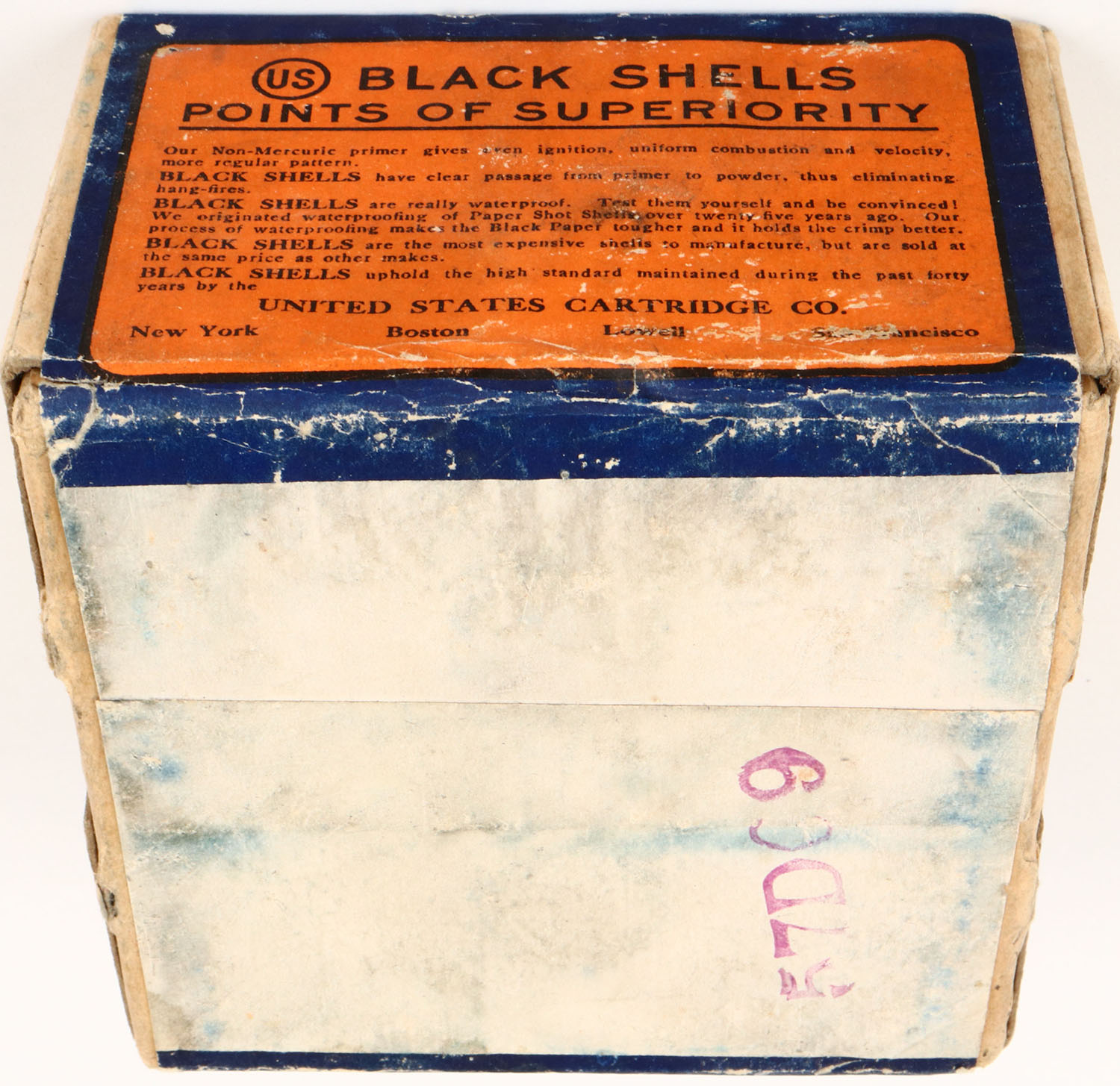 US Cart. Co., Lowell, Mass, Romax, 10ga, 2pc., FULL & SEALED, Black Powder 6 Shot, buff box orange, blue & white label, box has shell protrusions, with very nice colors. Grade: Excellent - Value: 70 to 300