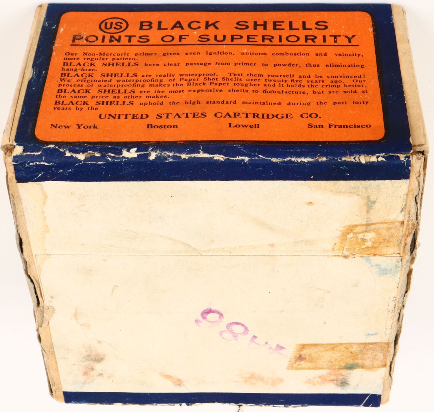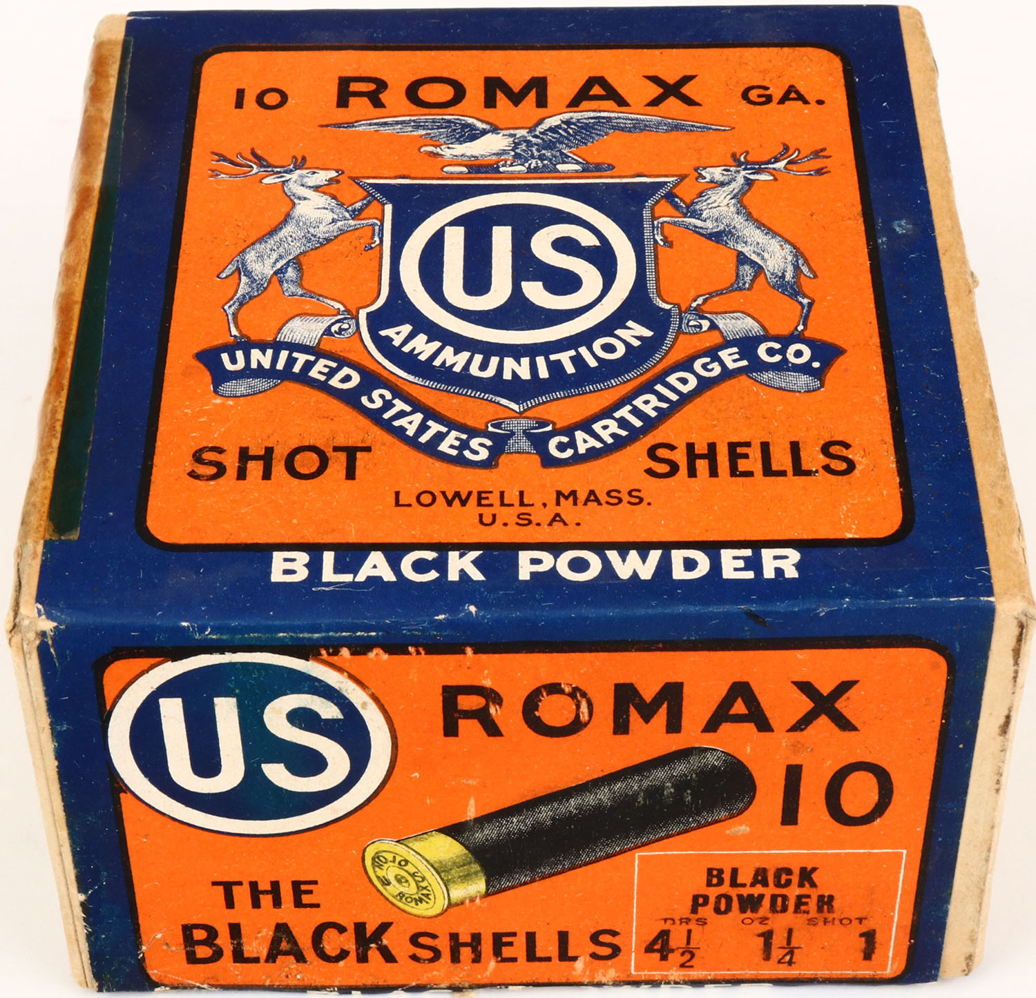 US Cart. Co., Lowell, Mass, Romax, 10ga, 2pc., Full, Black Powder 1 Shot, buff box orange, blue & white label, box has seam split, tape repairs, light age soiling with excellent colors, Shells are very good. Grade: Excellent - Value: 30 to 100
