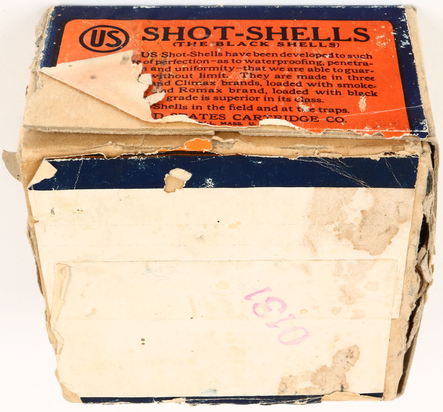 US Cart. Co., Lowell, Mass, Romax, 12ga, 2pc., Partial 16rds of incorrect ammo, Black Powder ? Shot, buff box orange, blue & white label, label is 70% intact, right side of is torn, box has seam split, shell protrusions, age soiling, with very good colors, Shells are very good. Grade: Very Good + - Value: 20 to 60