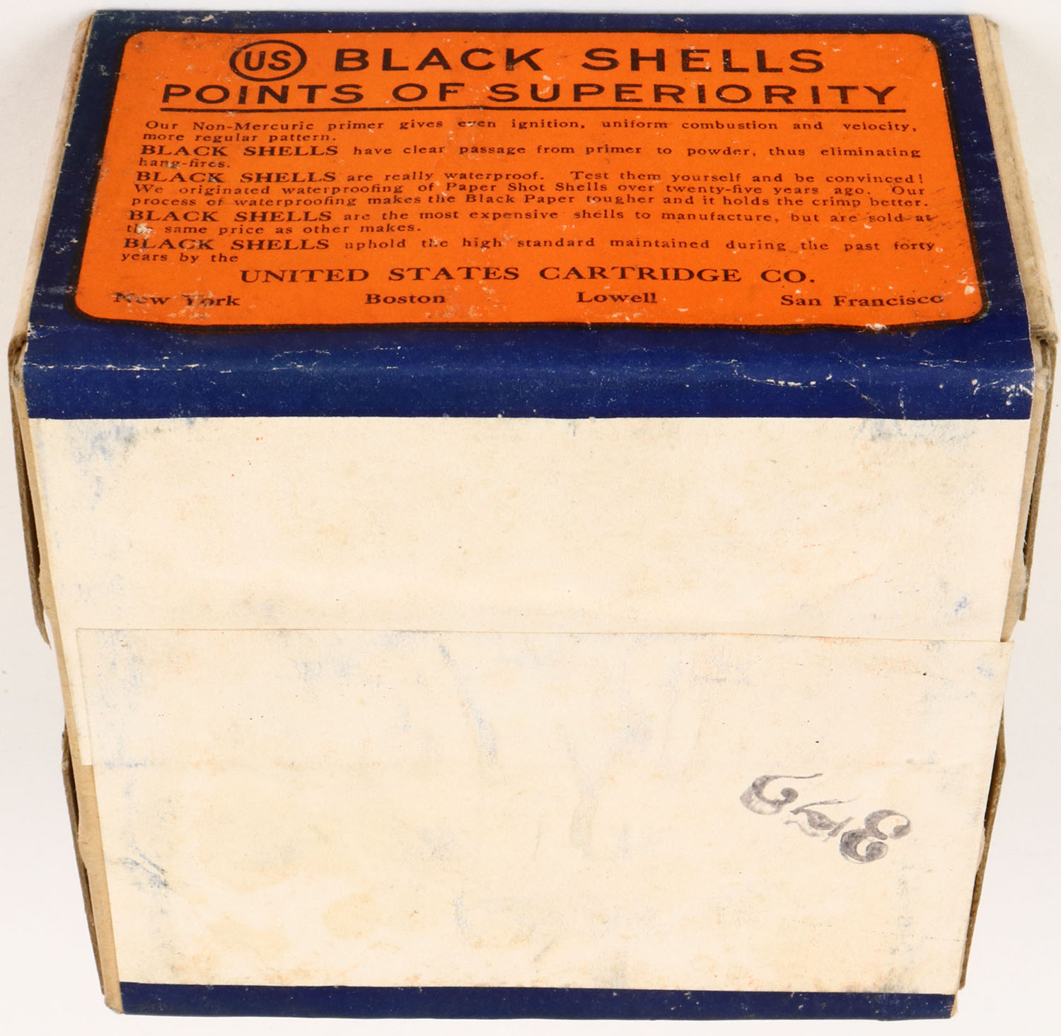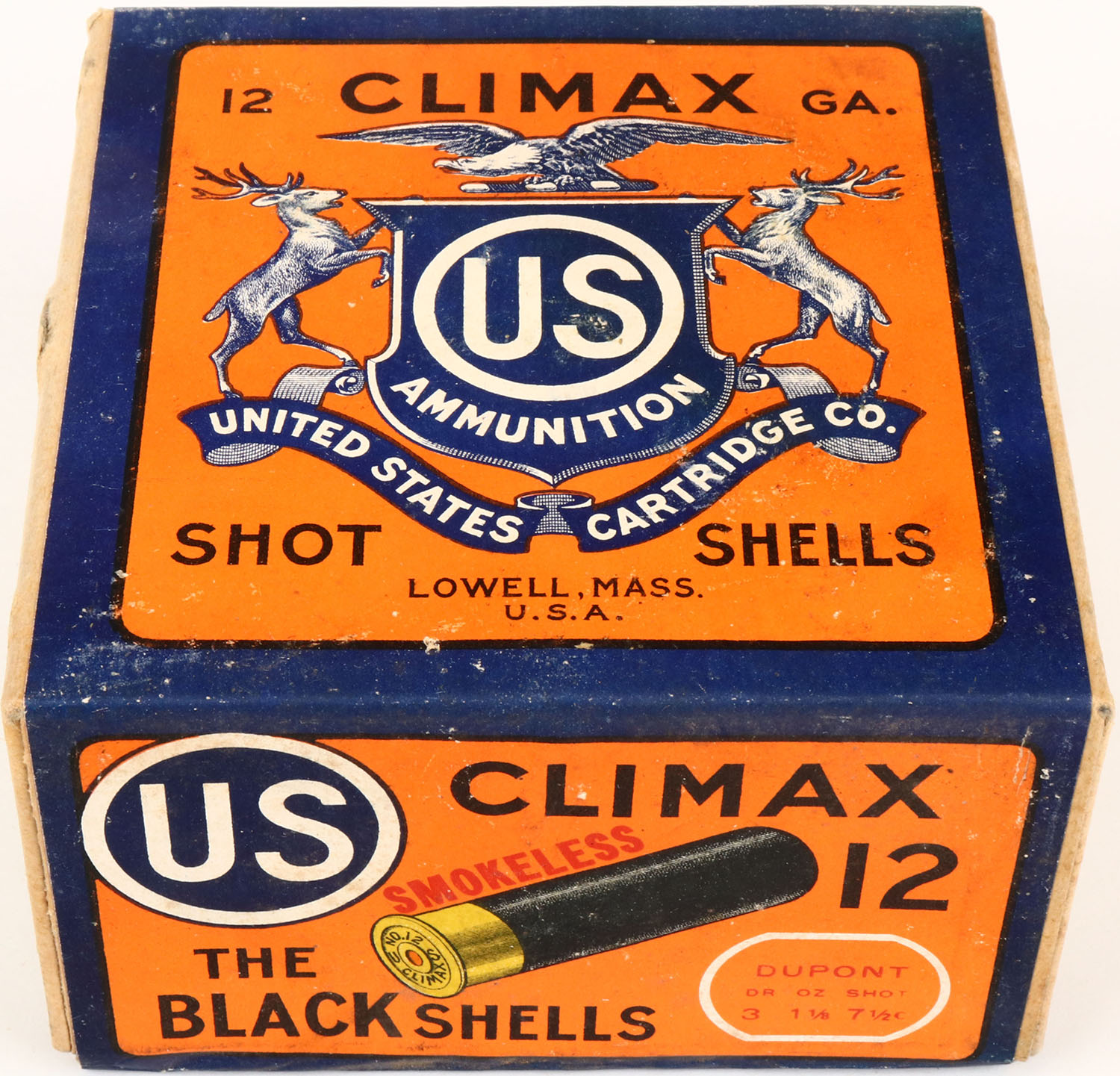 US Cart. Co., Lowell, Mass, Climax, 12ga, 2pc., FULL & SEALED, 7 1/2 C Shot, buff box orange, blue & white label, box has shell protrusion, with excellent colors. Grade: Excellent ++ - Value: 30 to 200