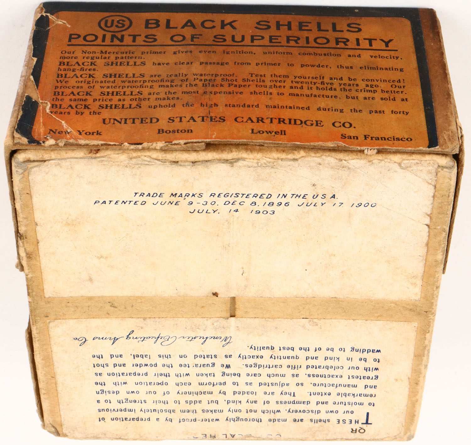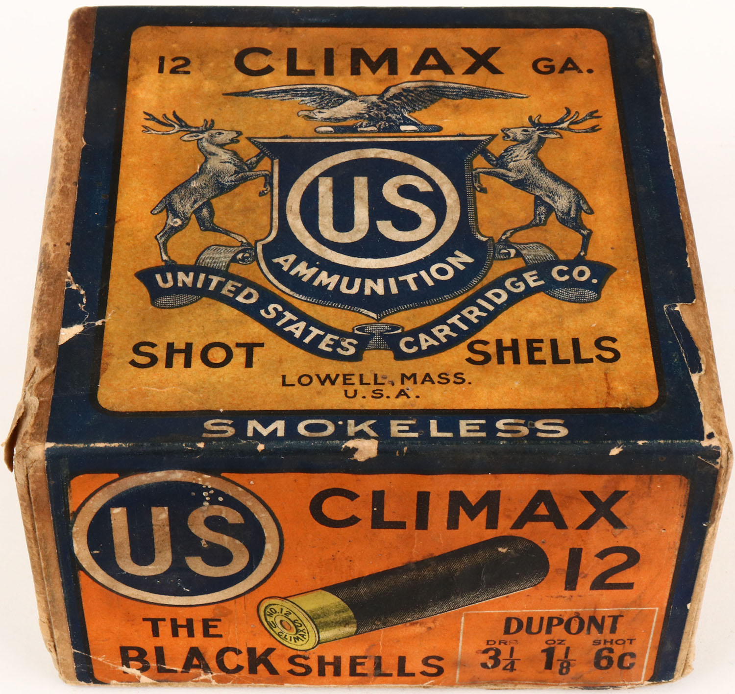 US Cart. Co., Lowell, Mass, Climax, 12ga, 2pc., shot size 6c Dupont, Empty, buff box orange, blue & white label, box has age soiling, box is torn on left side, has incorrect bottom label with very good label. Grade: Very Good + - Value: 20 to 40