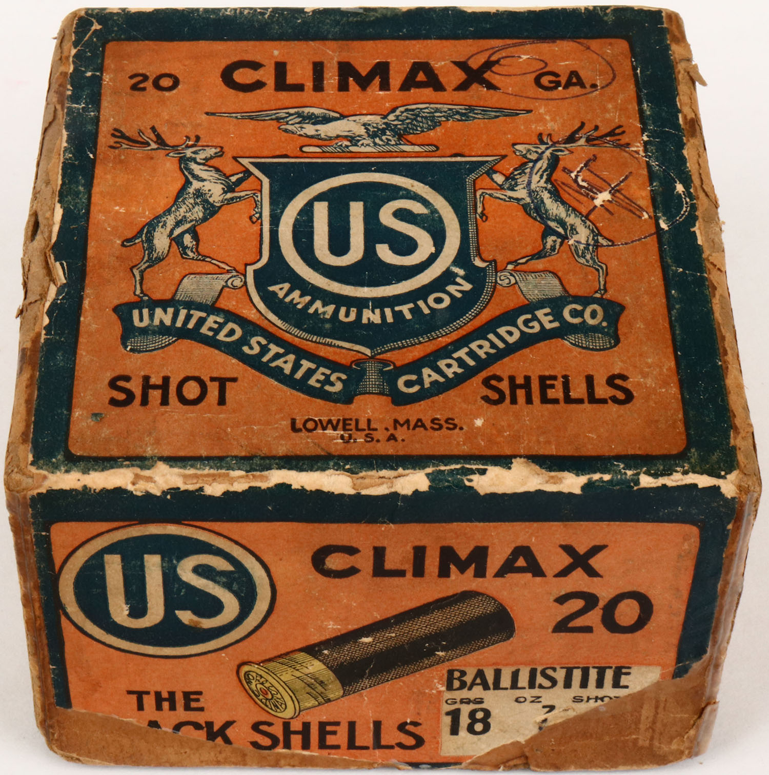 US Cart. Co., Lowell, Mass, Climax, 20ga, 2pc., shot size ? Ballistite, Full, buff box orange, blue & white label, box has tape repair, edge wear, age soiling, label is 90% intact. Shells are excellent. Grade: Very Good + - Value: 20 to 60