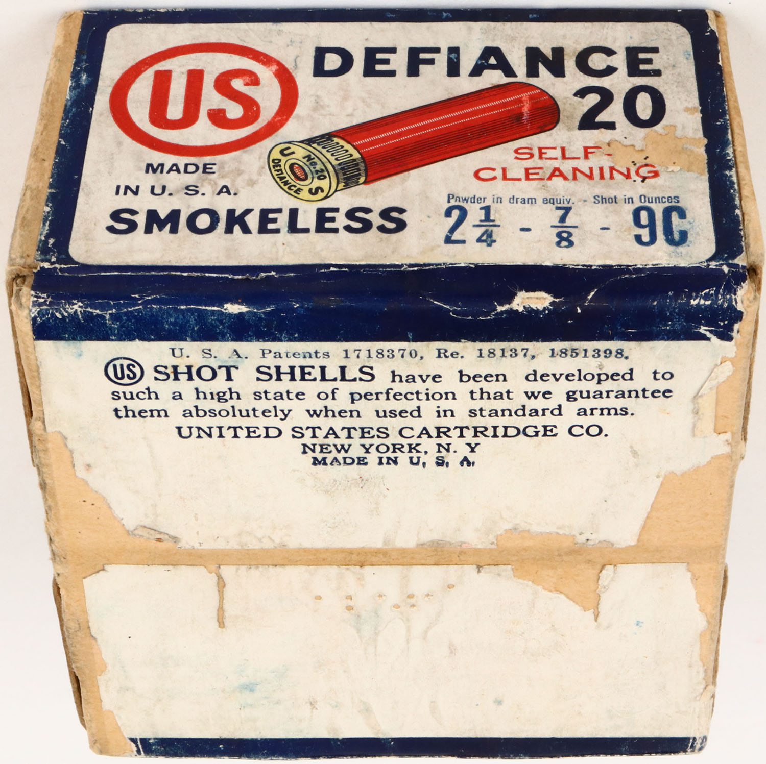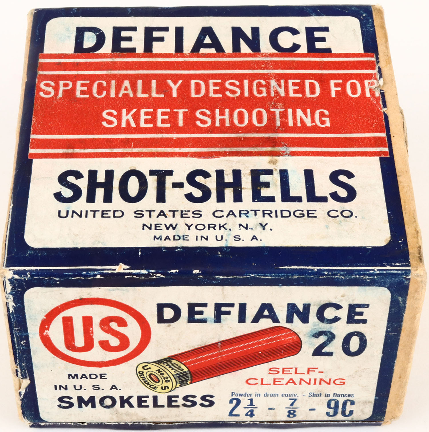 U.S. Cartridge Co., DEFIANCE, OVER LABEL ''SPECIALLY DESIGNED FOR SKEET SHOOTING'', 20ga., 2pc., Full, shot size 9C, buff box with red, white & blue label, box & label are excellent with light soiling. Shells are excellent. Grade: Excellent - Value: 50 to 200