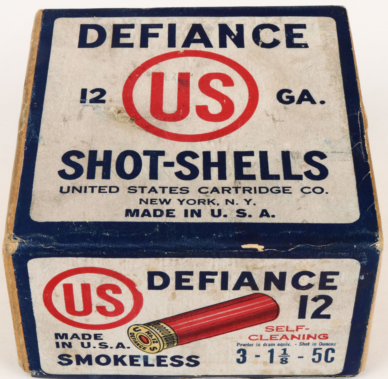 United States Cart. Co., New York, NY, DEFIANCE, 12ga., 2pc., Full, 5C, buff box with white, red & blue label, box is very solid with very nice label and light age soiling, shells are excellent. Grade: Excellent + - Value: 50 to 150