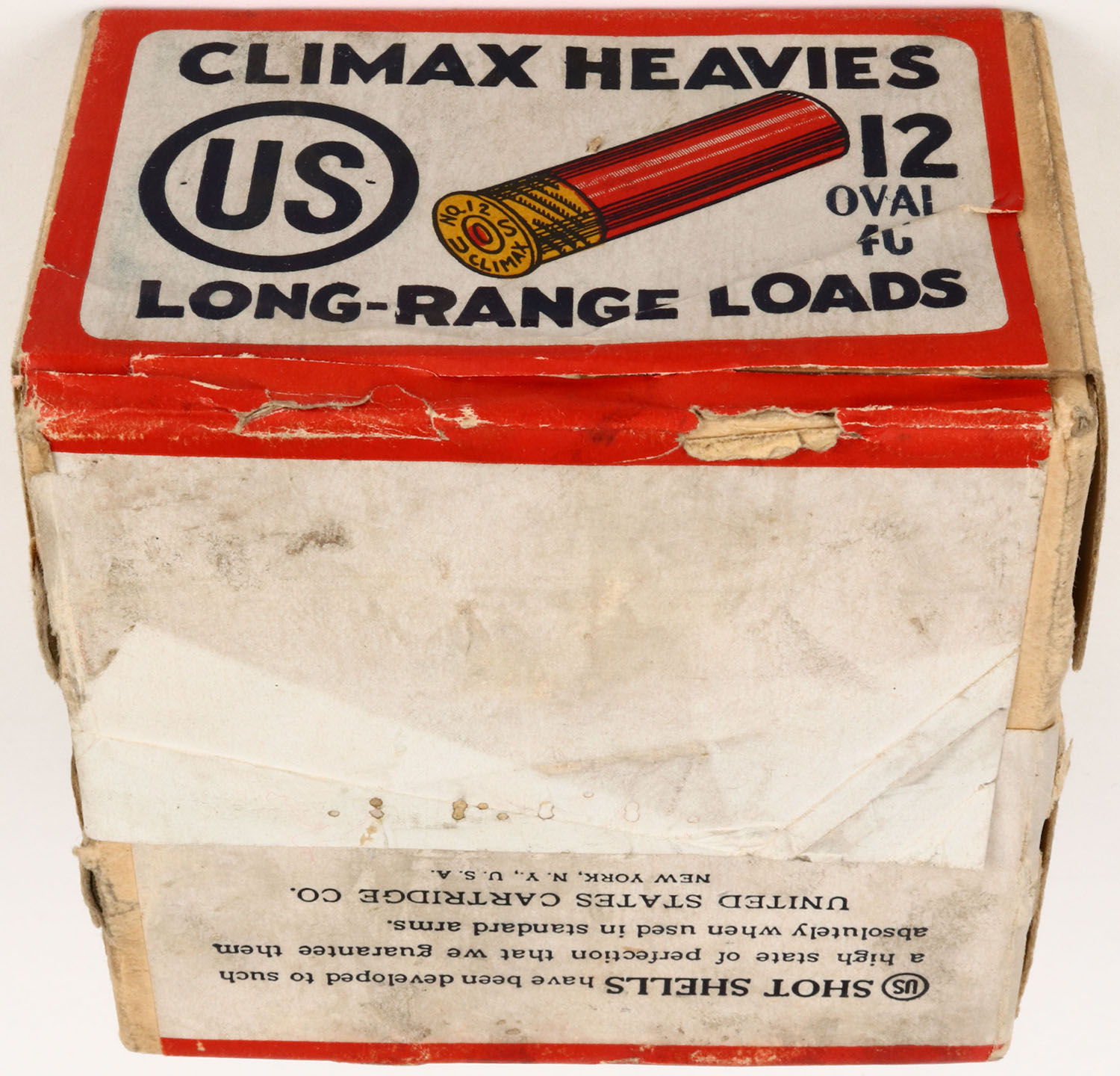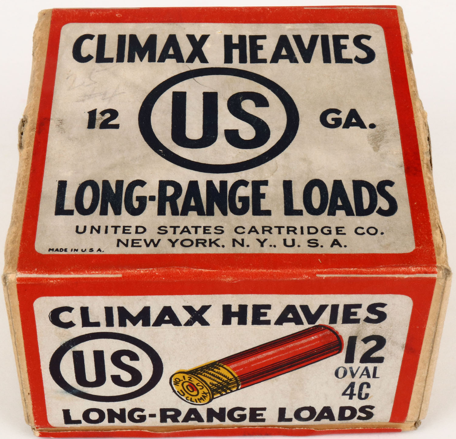 U.S. Cart. Co., New York, NY, CLIMAX HEAVIES, 12ga., 2pc., Full, shot size 4C OVAL, buff box with white, orange & blue paper label, box has shell protrusions & label is very nice with light soiling, Shells are excellent. Grade: Very Good ++ - Value: 20 to 100