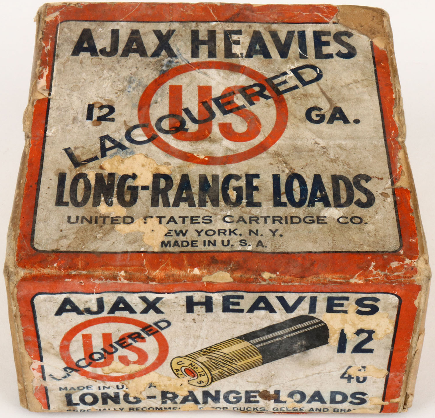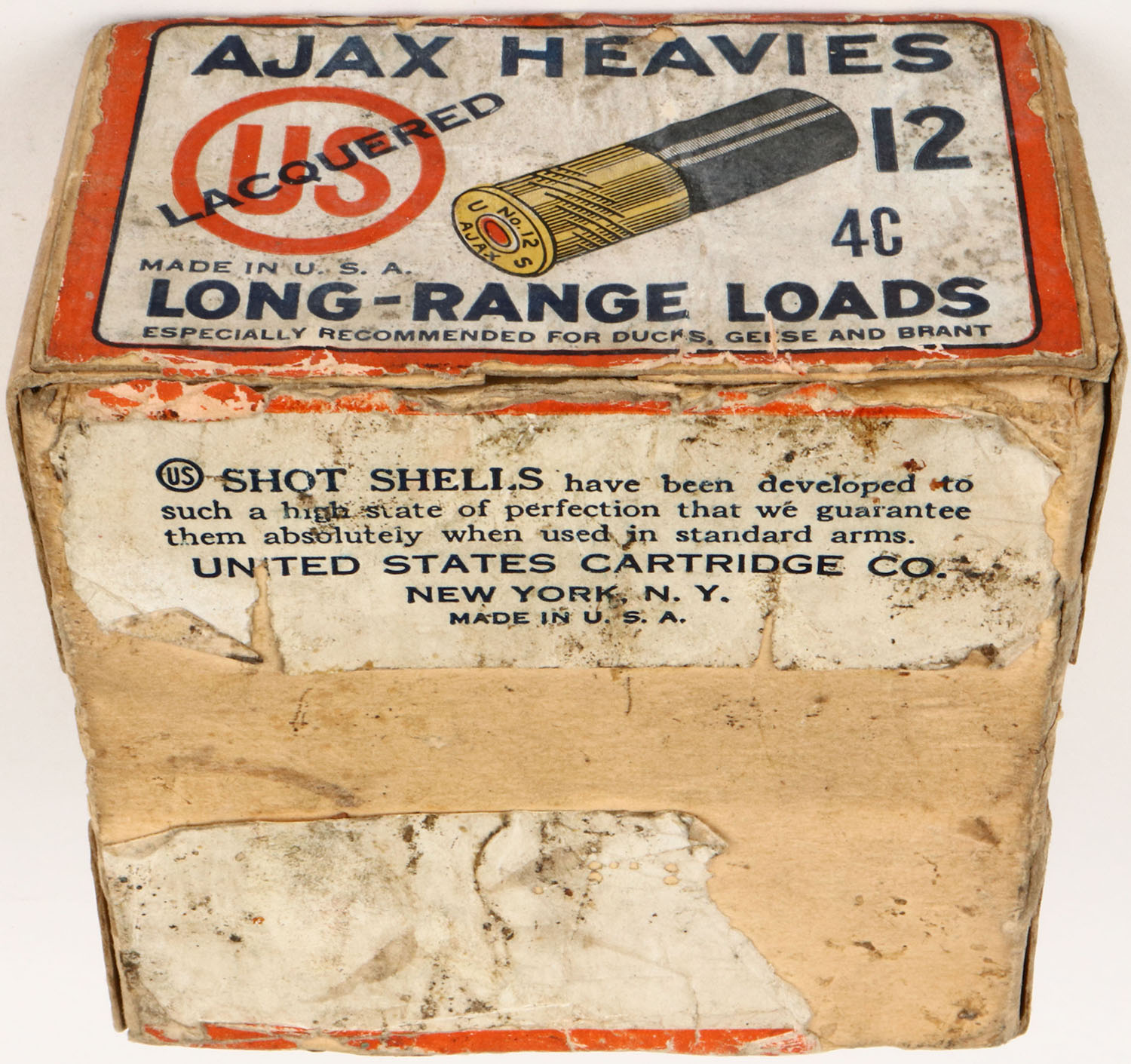 U.S. Cart. Co., New York, NY, AJAX HEAVIES, Lacquered, 12ga., 2pc., Empty, shot size 4C, buff box with white, orange & blue paper label, box has age soiling, scuffing, seam split. Grade: Very Good + - Value: 10 to 50