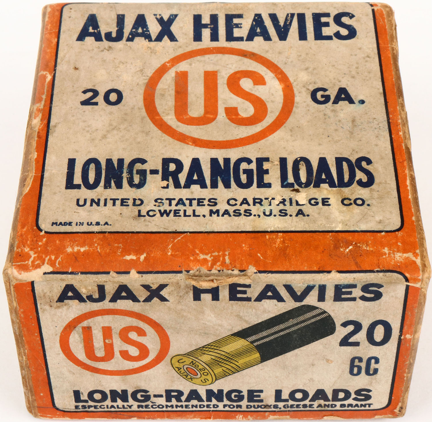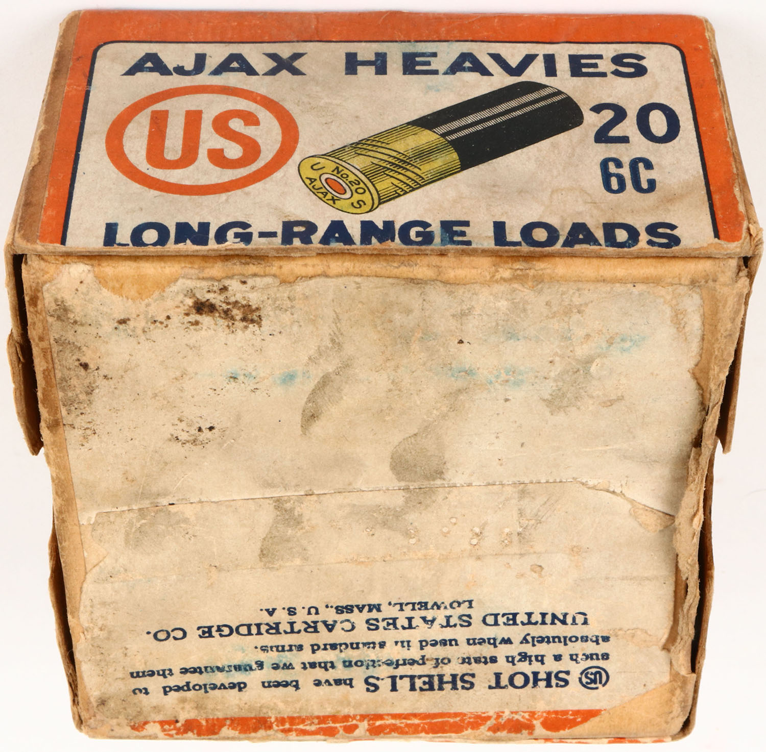U.S. Cart. Co., New York, NY, AJAX HEAVIES, 20ga., 2pc., Empty, shot size 6C, buff box with white, orange & blue paper label, box has age soiling, seam split, light edge wear. Grade: Very Good ++ - Value: 10 to 50