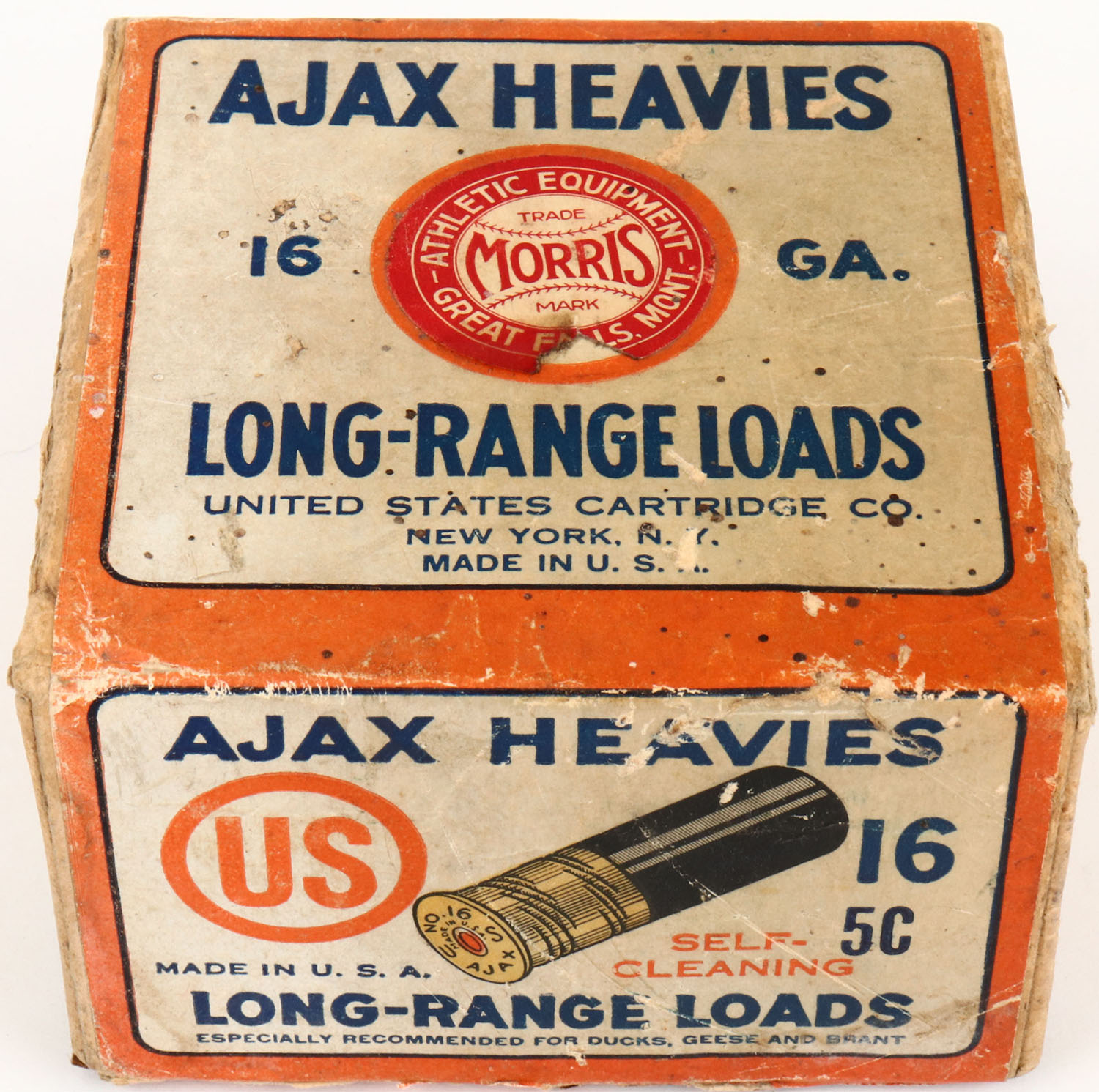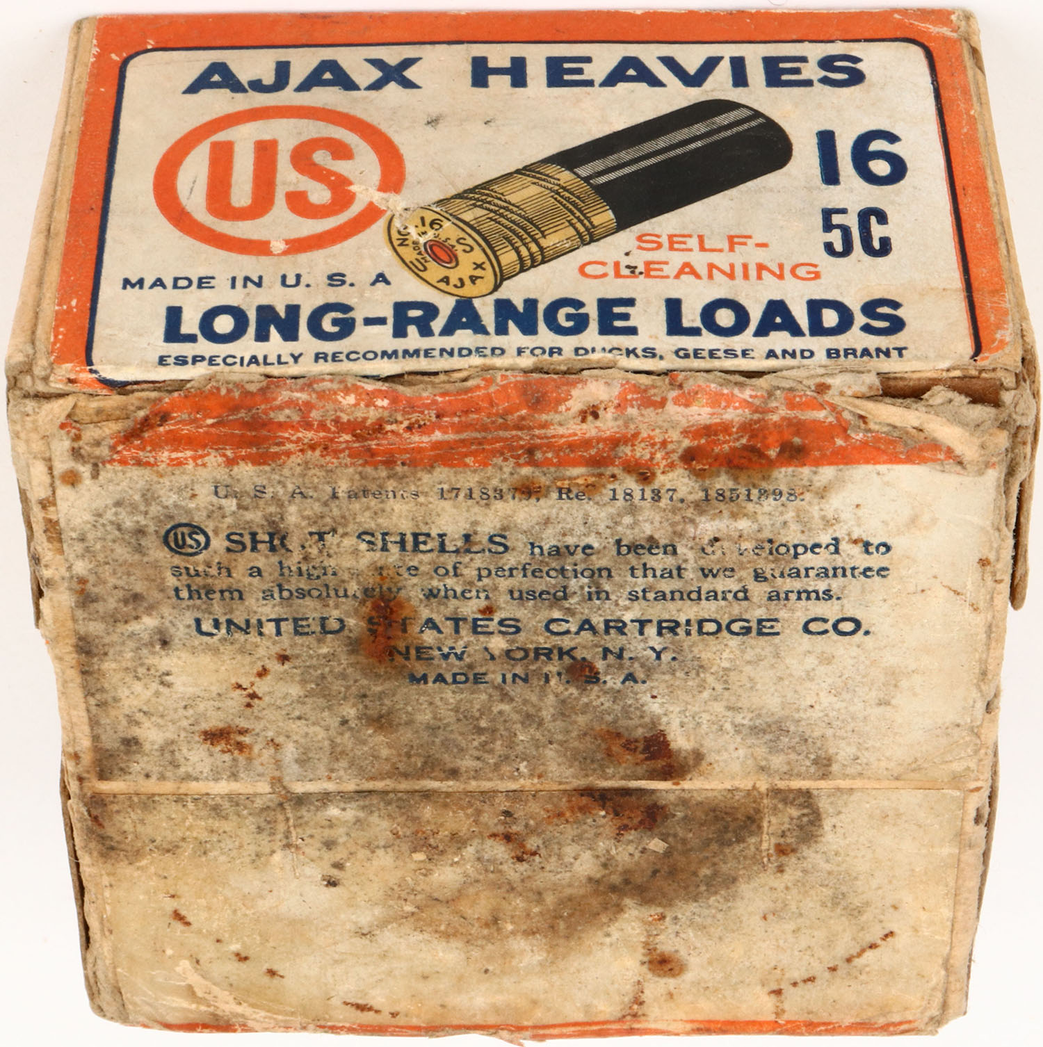 U.S. Cart. Co., New York, NY, AJAX HEAVIES, 16ga., 2pc., Partial 15rds, shot size 5C, buff box with white, orange & blue paper label, box has seam splits, age soiling, edge wear, tape repairs with sticker over top US logo. Shells are very good. Grade: Very Good + - Value: 10 to 50